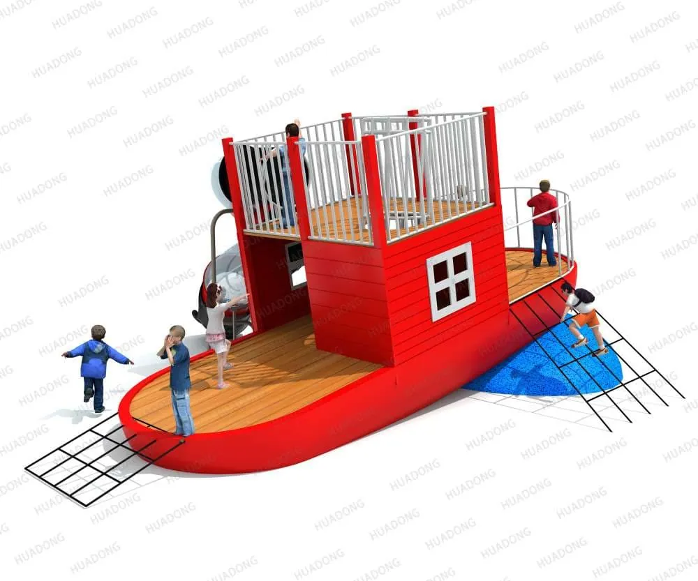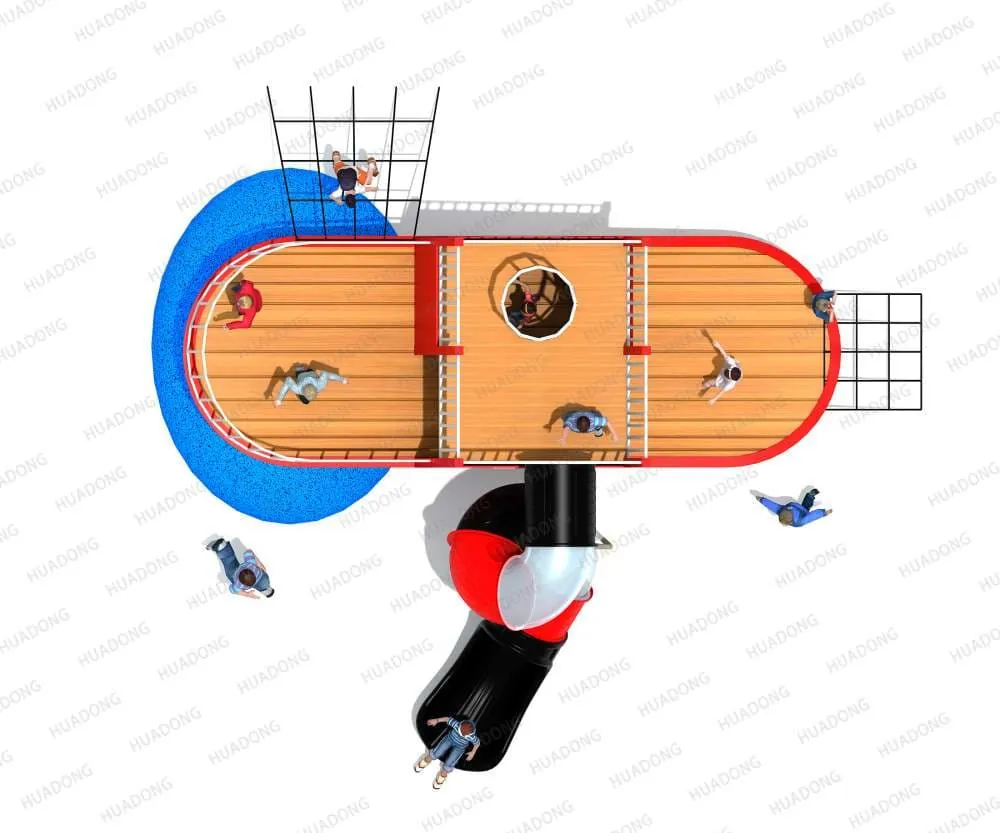 The design of the wooden pirate ship combination slide is themed around nature incorporating elements such as the hull mast and deck with a novel appearance and sturdy structure. It integrates functions like climbing sliding and swinging aiming to