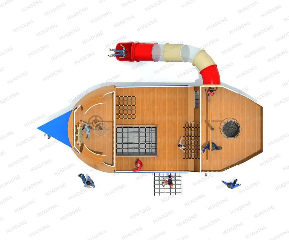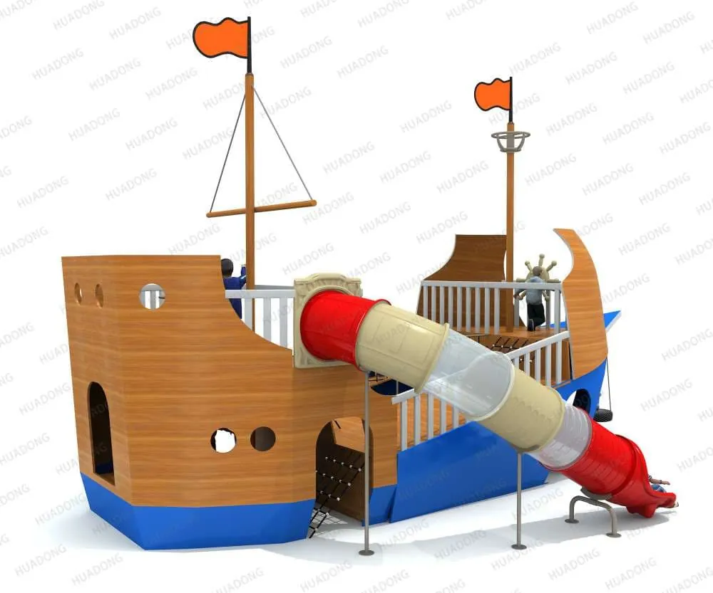 The design of the wooden pirate ship combination slide is themed around nature incorporating elements such as the hull mast and deck with a novel appearance and sturdy structure. It integrates functions like climbing sliding and swinging aiming to