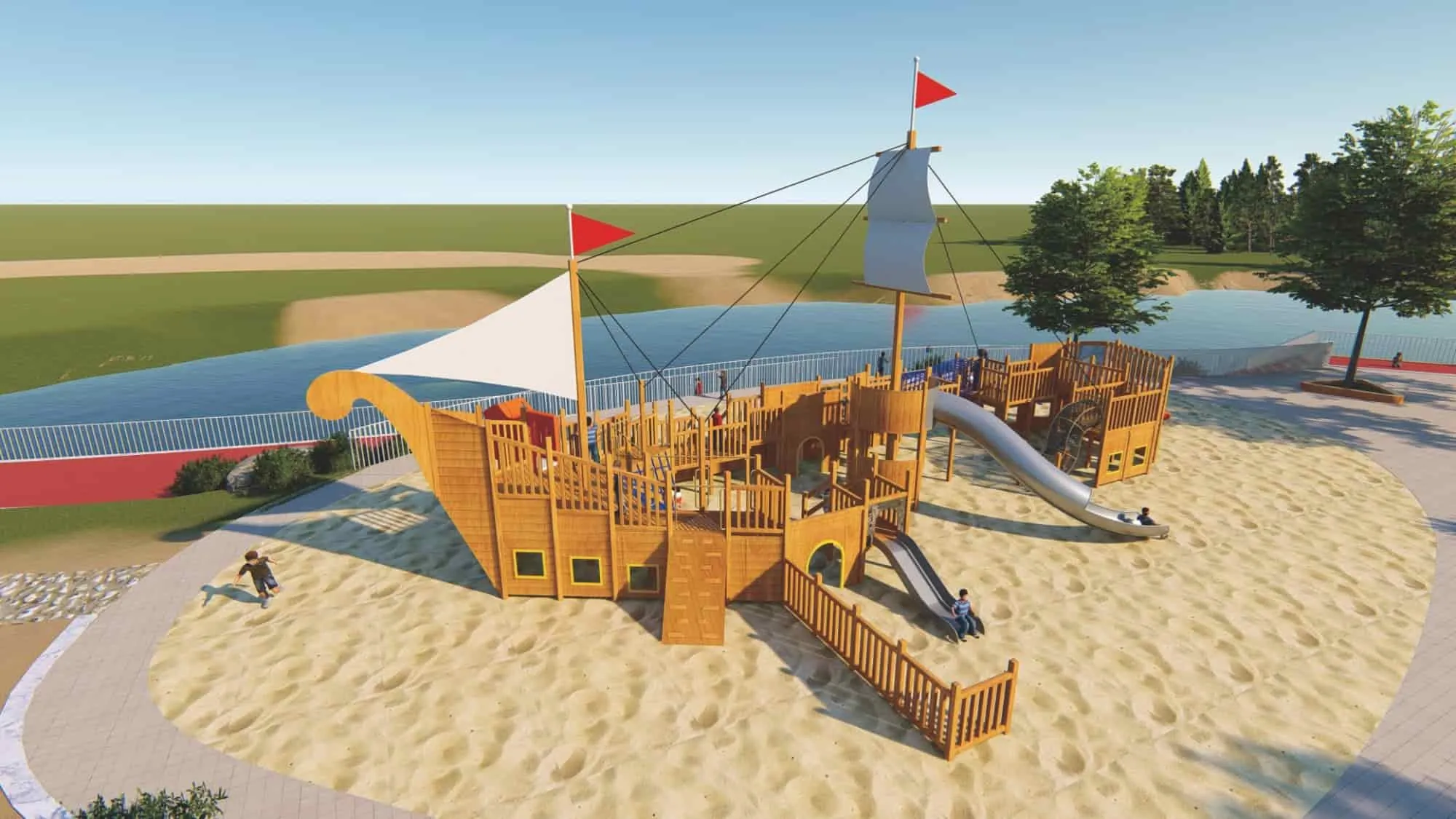 The design of the wooden pirate ship combination slide is themed around nature incorporating elements such as the hull mast and deck with a novel appearance and sturdy structure. It integrates functions like climbing sliding and swinging aiming to