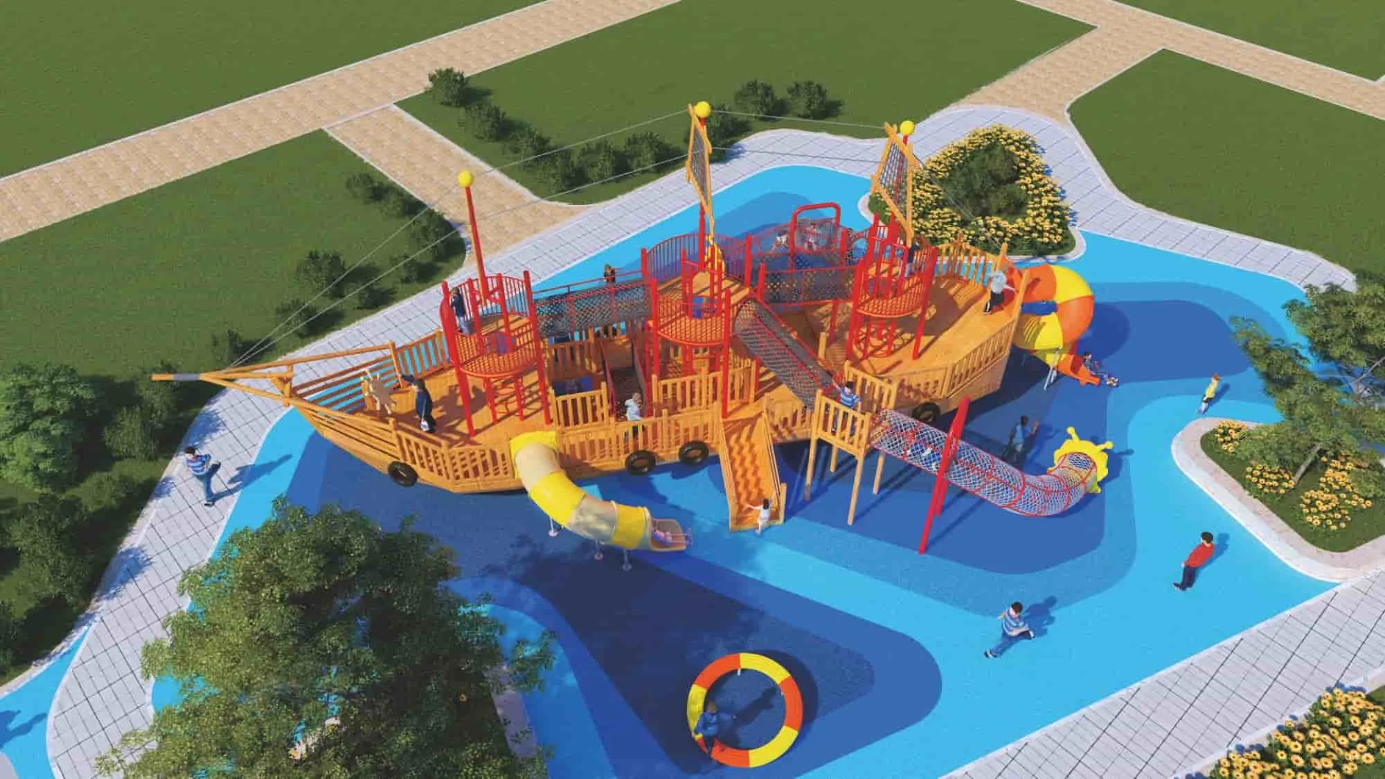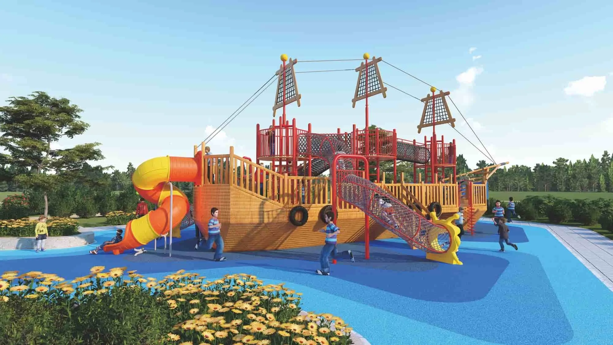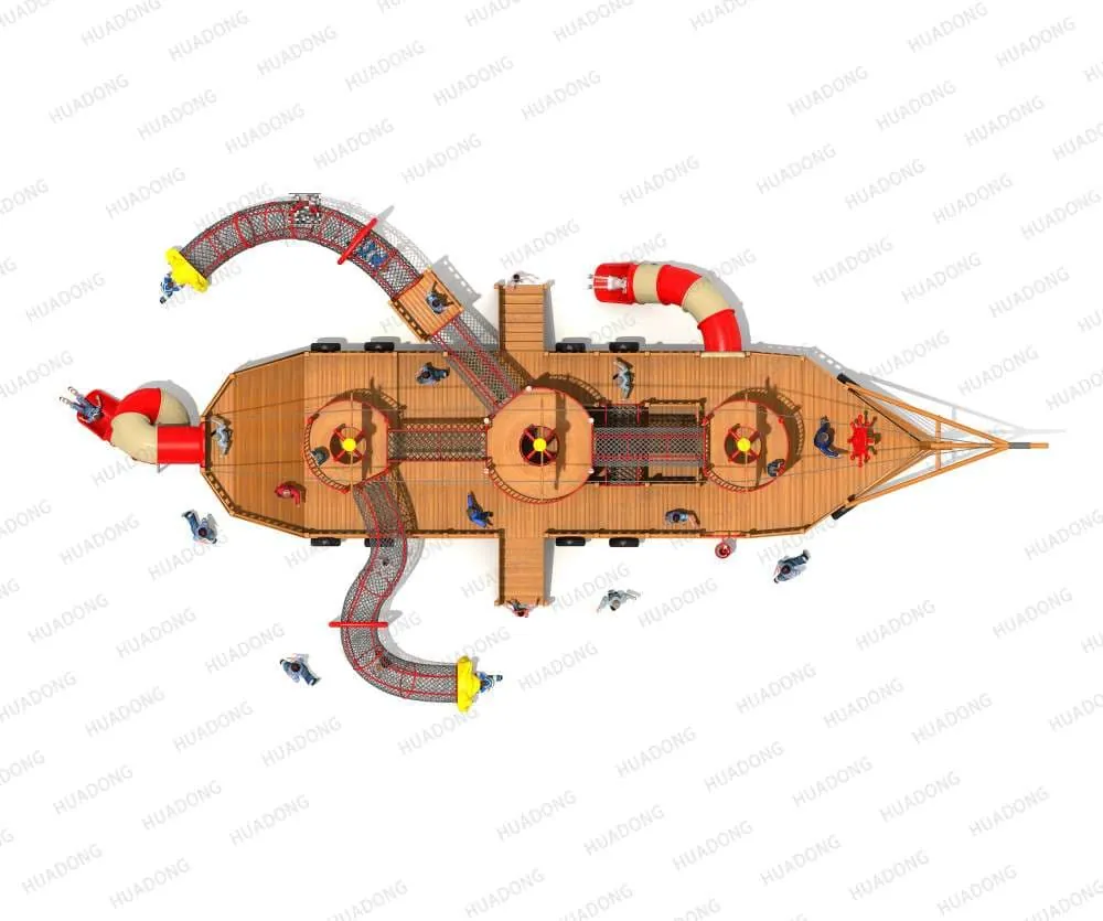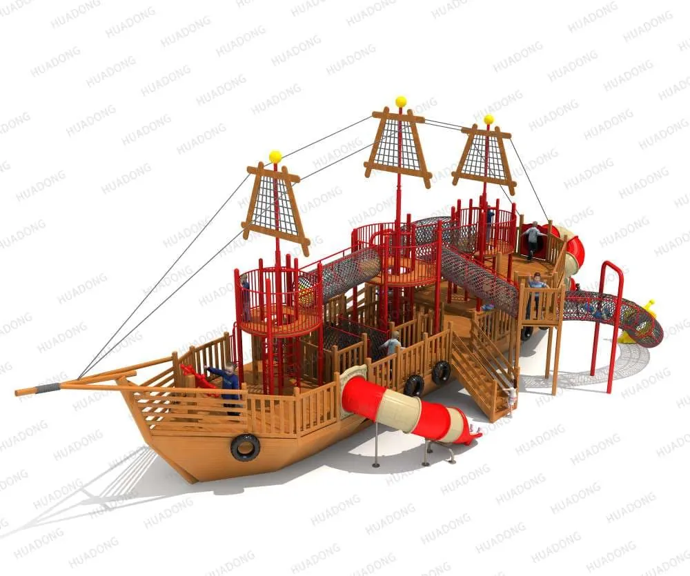 The design of the wooden pirate ship combination slide is themed around nature incorporating elements such as the hull mast and deck with a novel appearance and sturdy structure. It integrates functions like climbing sliding and swinging aiming to