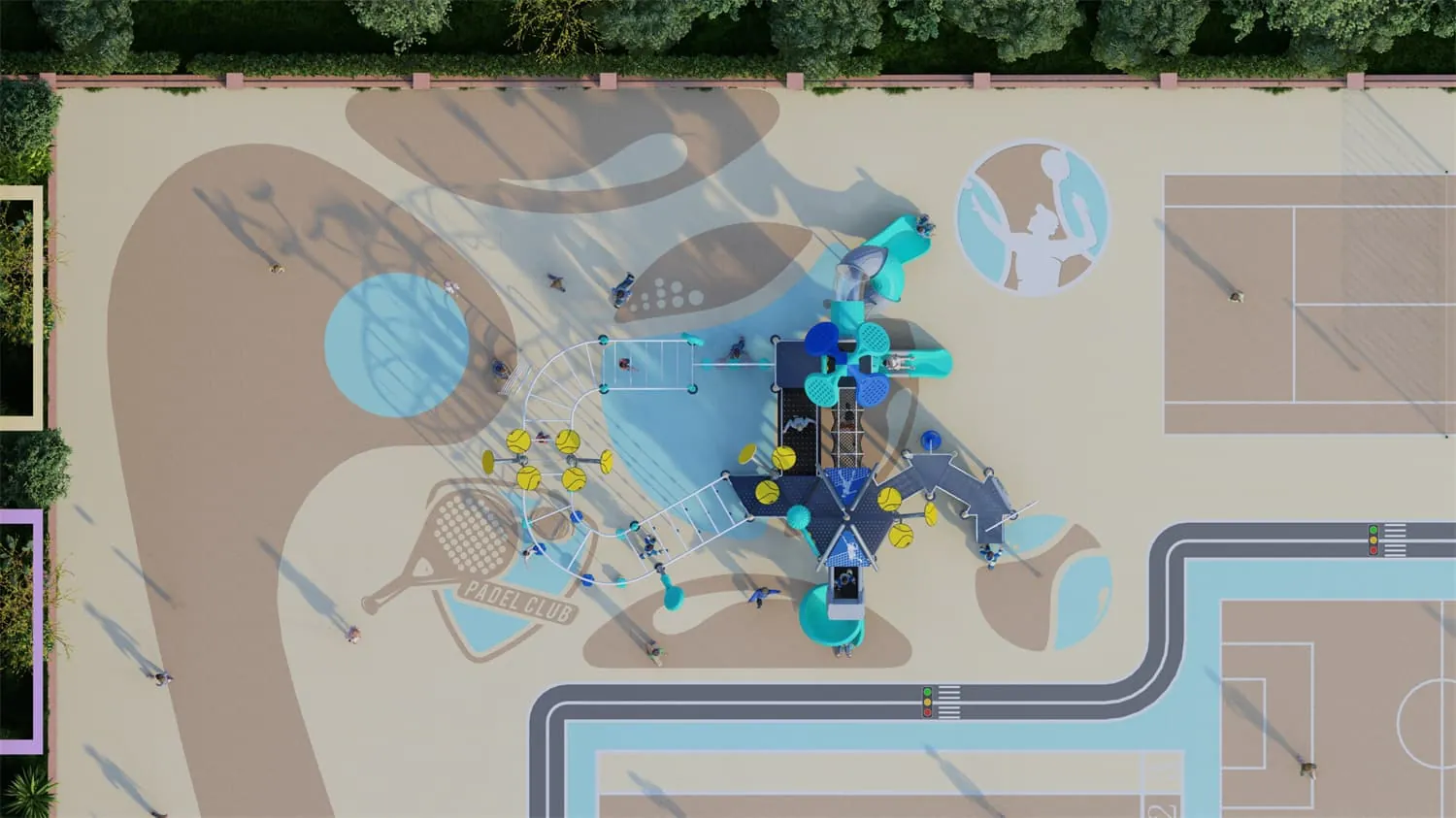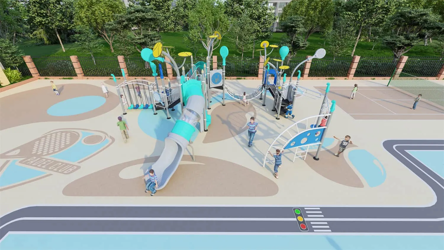 This is a playground paradise specially designed for children who love tennis and outdoor activities. The slide draws inspiration from tennis elements featuring vibrant colors and dynamic designs. The top is shaped like a tennis racket vivid and imagina
