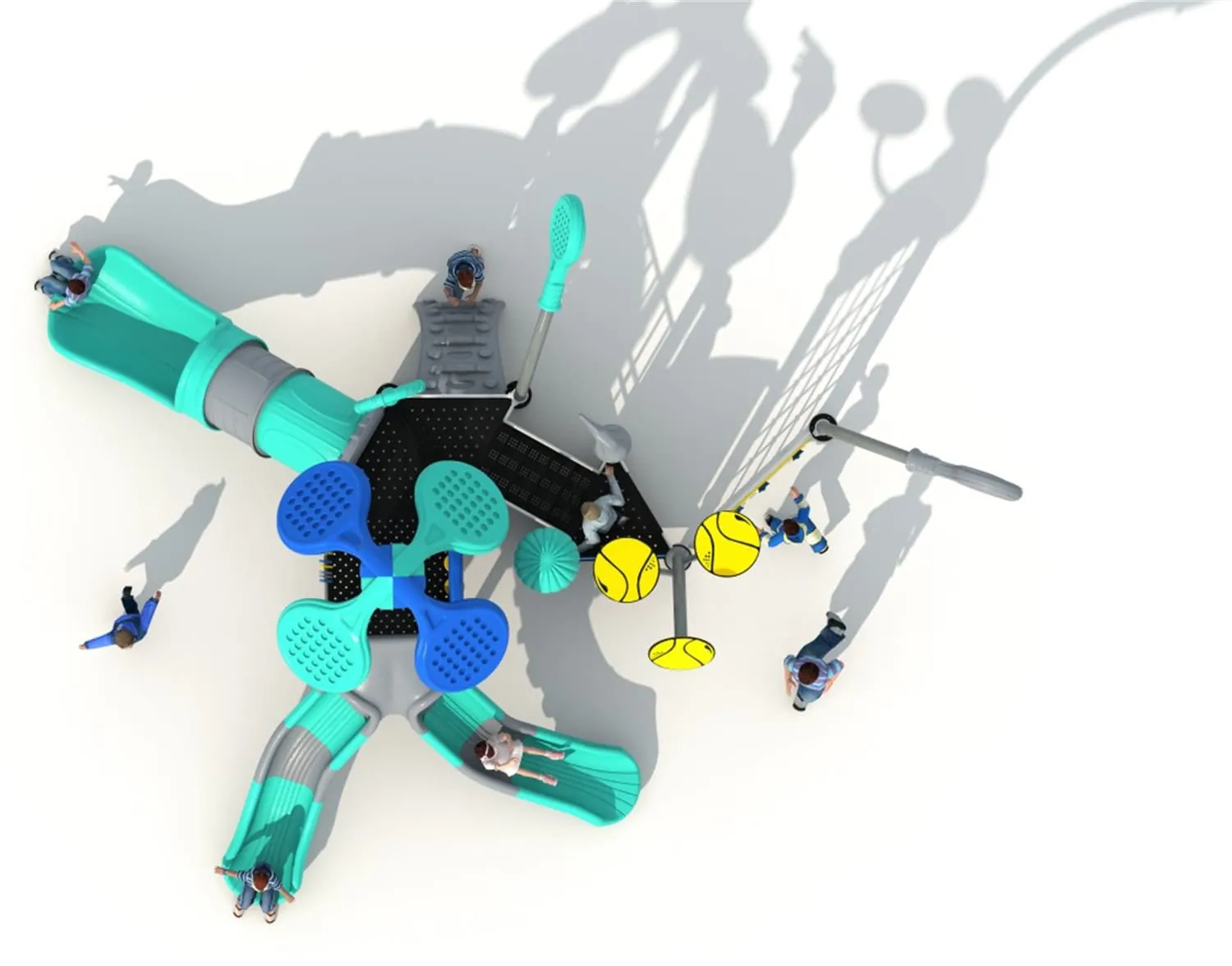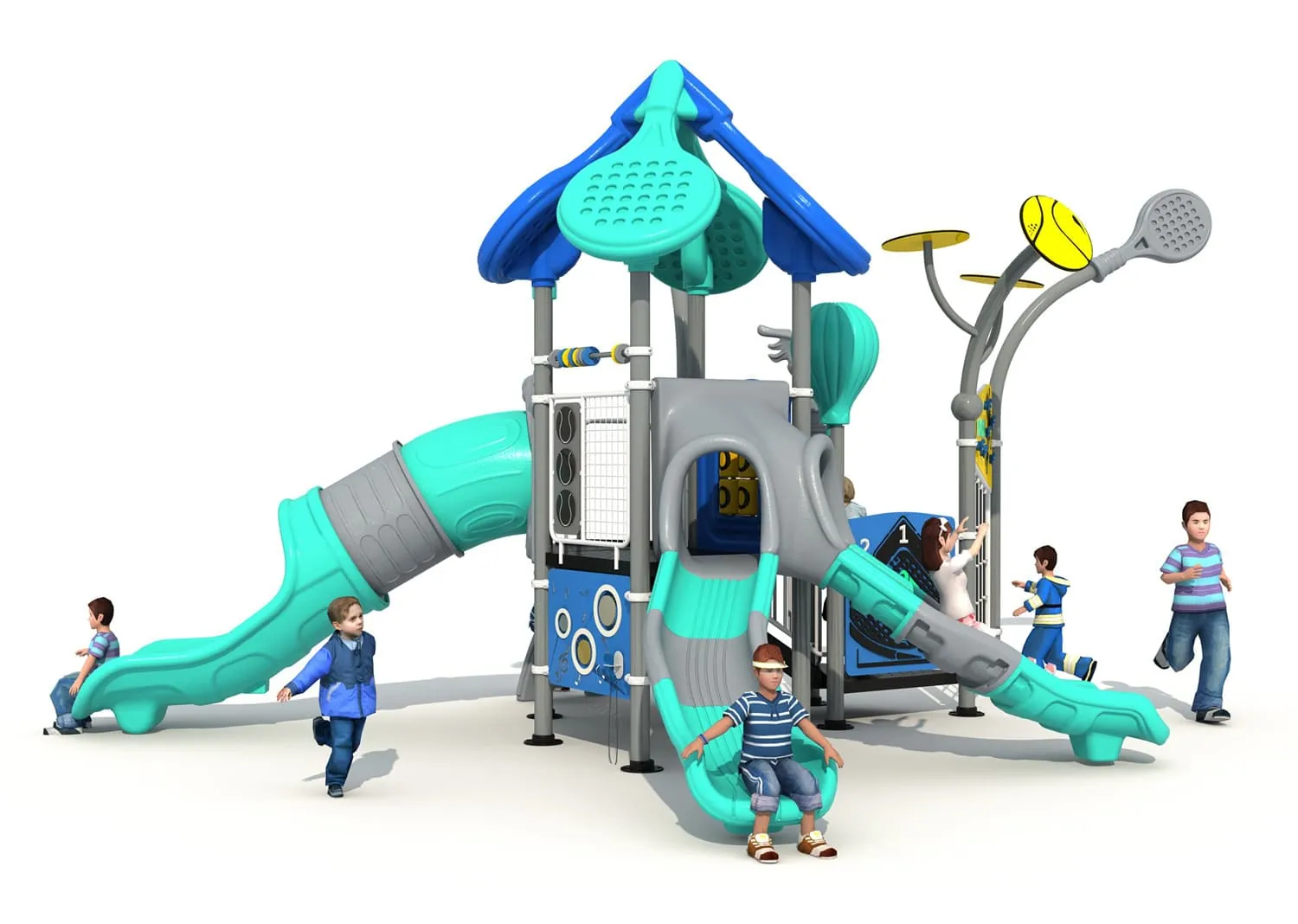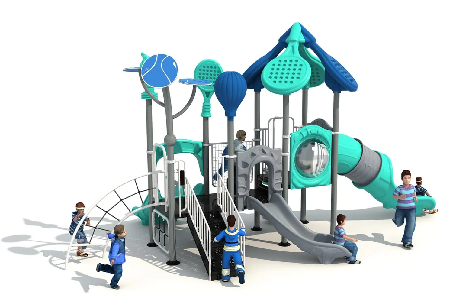 This is a playground paradise specially designed for children who love tennis and outdoor activities. The slide draws inspiration from tennis elements featuring vibrant colors and dynamic designs. The top is shaped like a tennis racket vivid and imagina