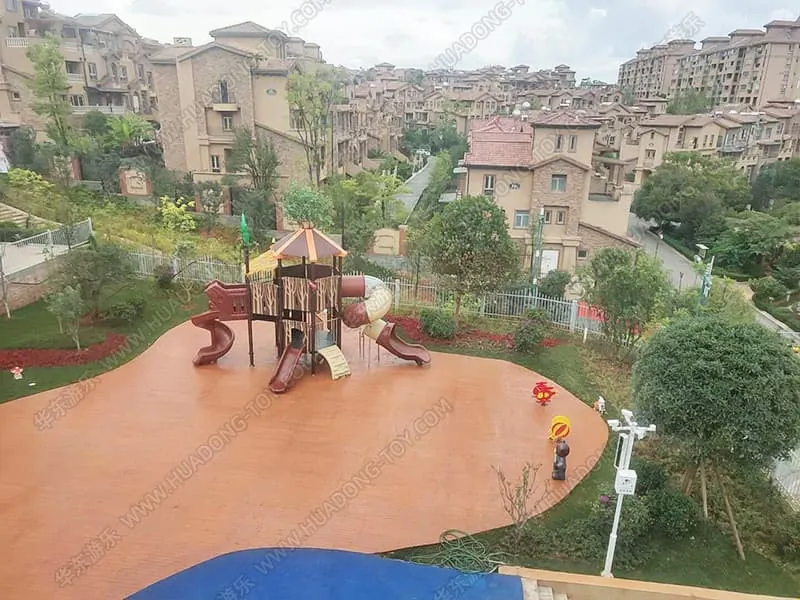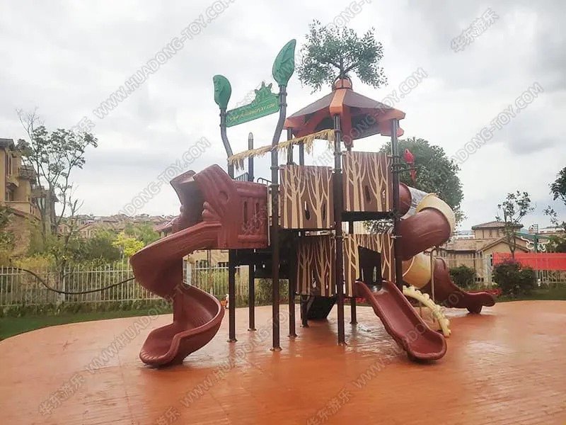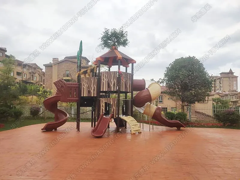 This project features the Forest Series combination slide from Huadong Amusement. The equipment's colors were chosen to perfectly complement the environment and buildings, creating a masterful finishing touch.