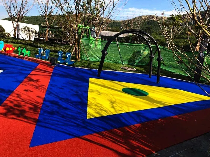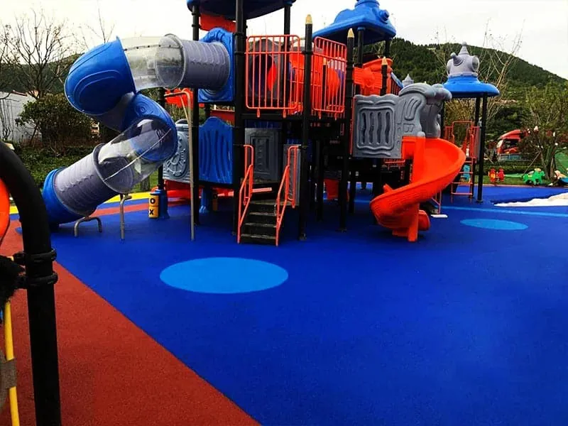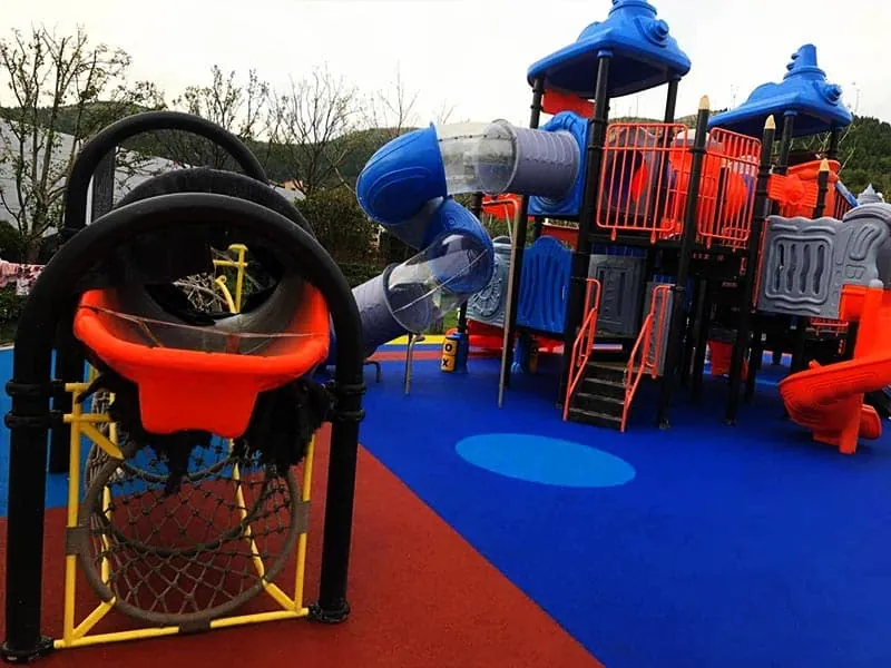 This large outdoor slide set is themed around the Sailah, featuring additional play equipment such as a seesaw, a swing set, and a climbing net. These elements showcase the playground's diverse and well-equipped design.