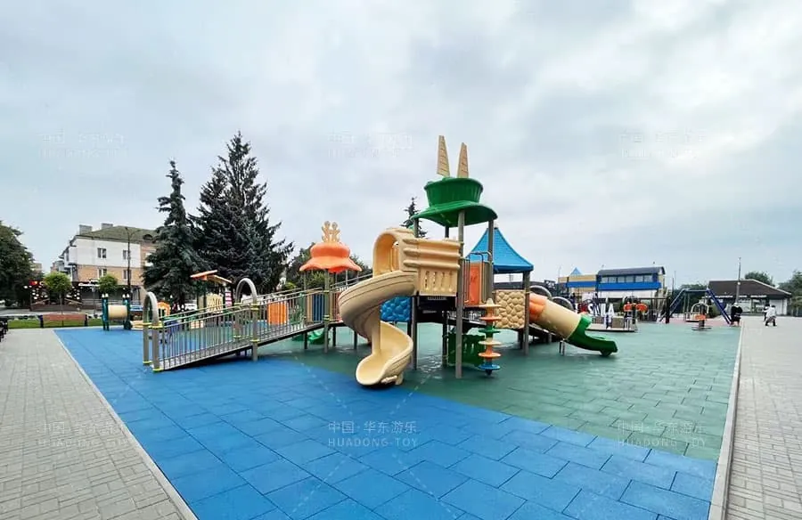 The project uses the sports series slides independently developed and produced by HUADONG Amusement, which includes climbing rocks, children's swings, fitness equipment, children's rotating chairs, and other amusement facilities in the playground.