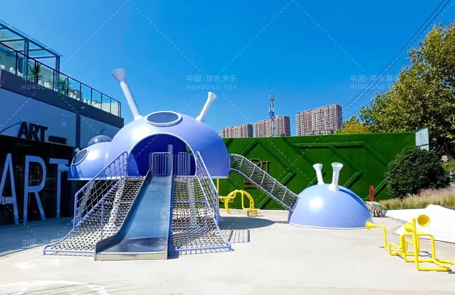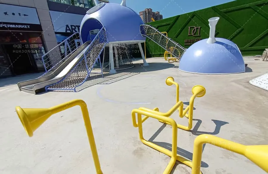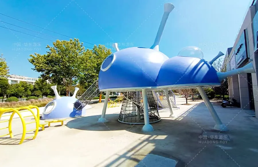 This project features amusement equipment with a flying saucer theme independently designed by HUADONG Amusement, adding functions such as speaking tubes, climbing nets, children's swings, crawl tunnels, and stainless steel slides.