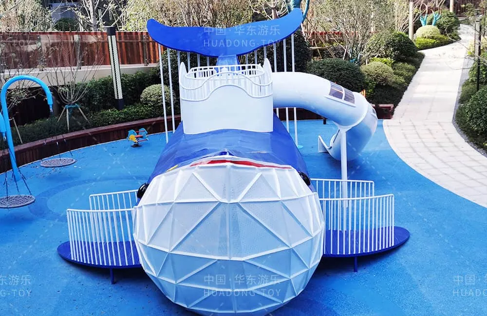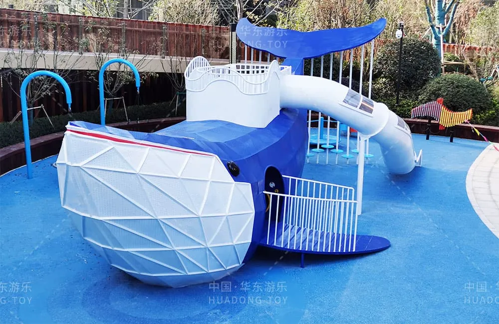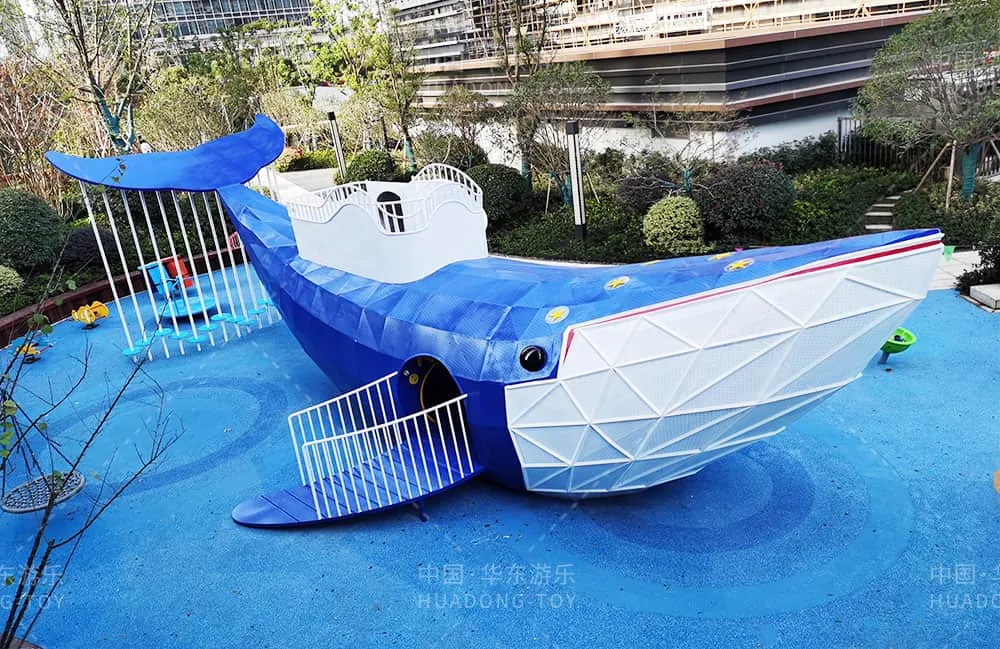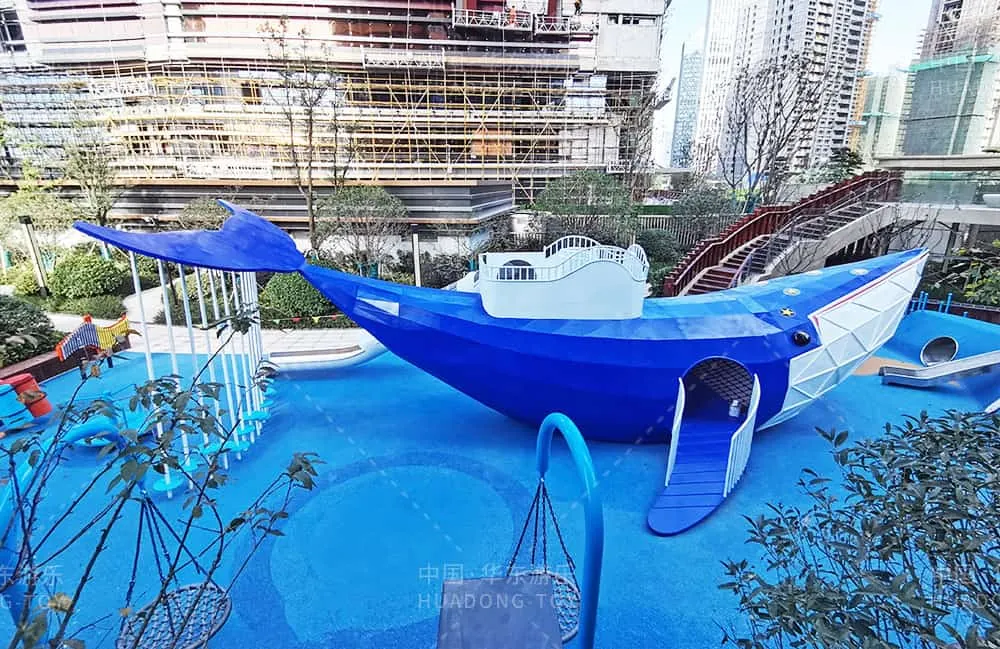 The entire project uses a blue ocean theme, with a large whale as the main piece of playground equipment. The whole playground was designed to fit the community's specific needs, providing a space for residents to live, relax, and have fun.
