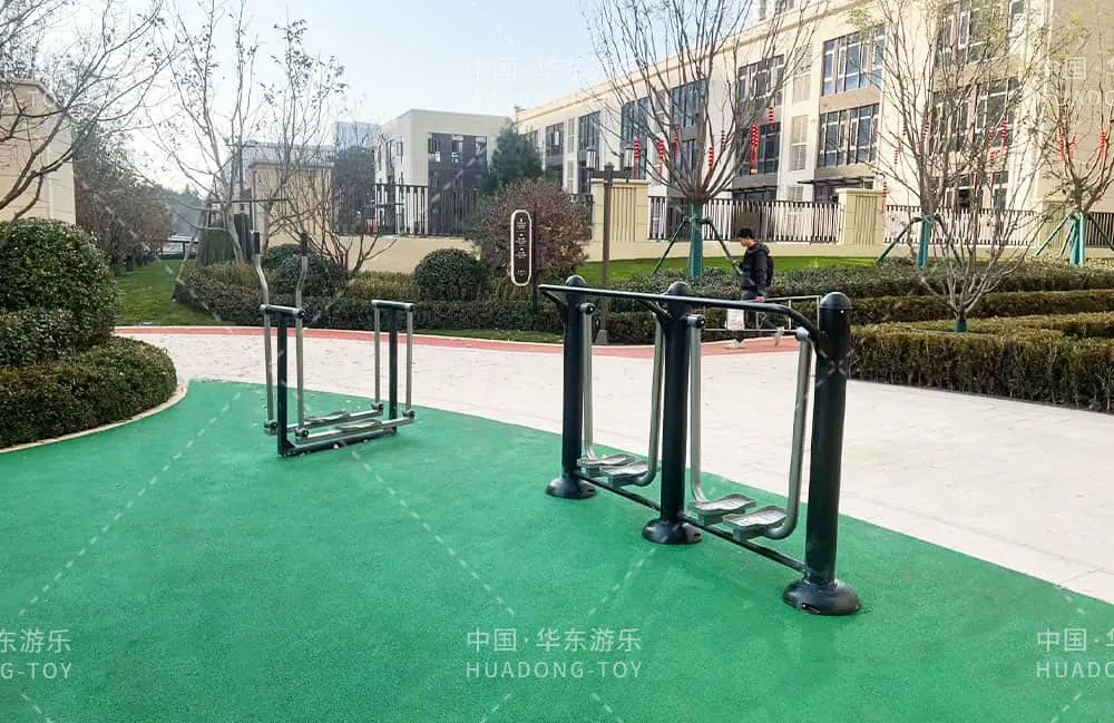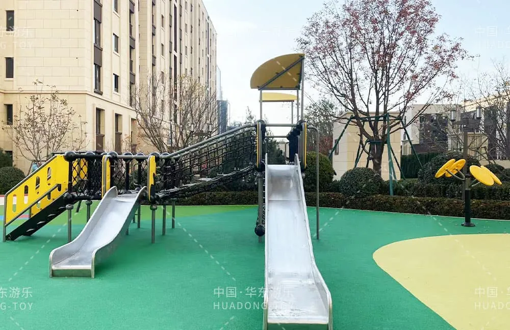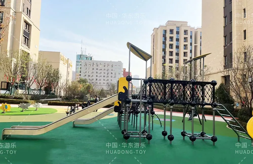 The playground equipment, independently developed by Huadong Amusement, is a comprehensive set that includes fitness gear, a climbing net, and a stainless steel slide.