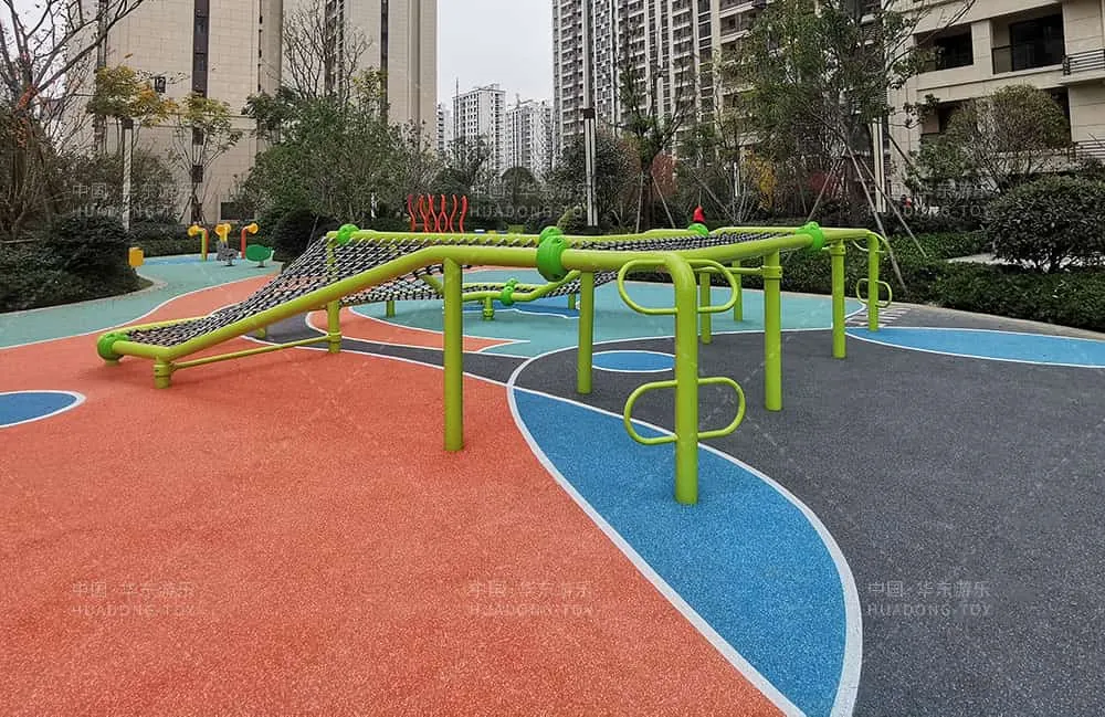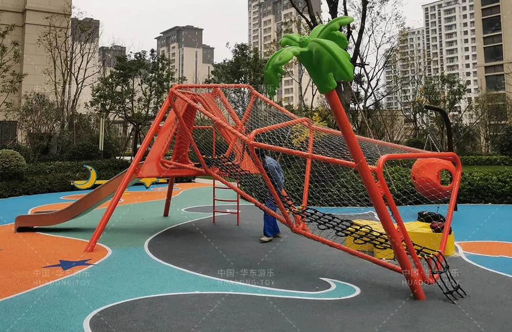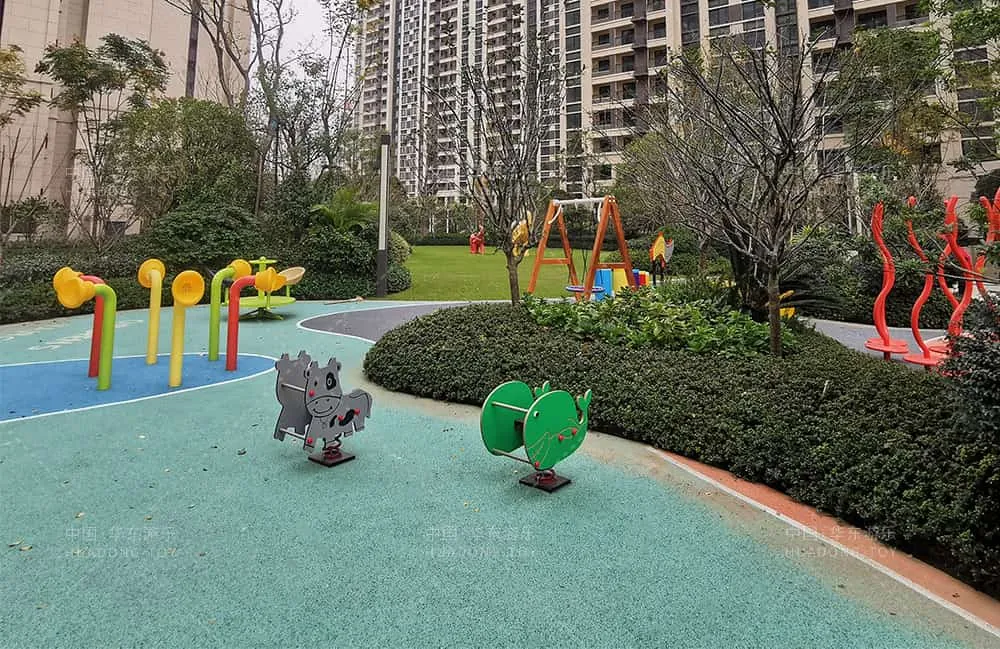 The playground is equipped with children's favorite play items including a climbing net crawl tunnels a stainless steel slide spring riders talking tubes and percussion instruments.