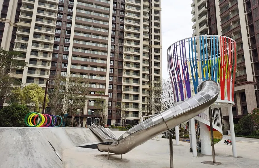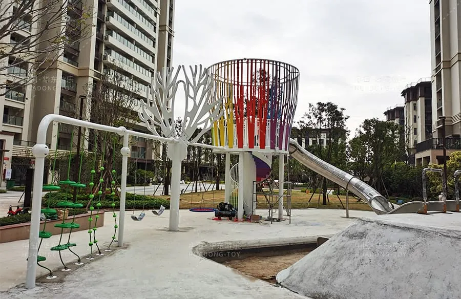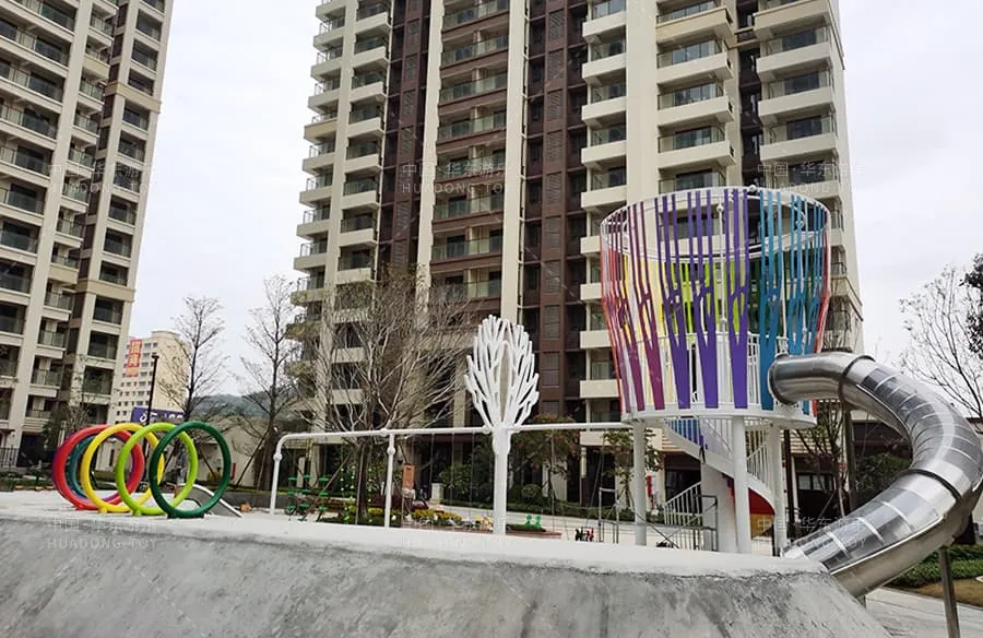 The playground at Phase II of Qingyang features custom-designed equipment from Huadong Amusement. It includes a large "influencer" slide a gourd-shaped climbing structure climbing ropes and a swing set providing residents with a recreational space.