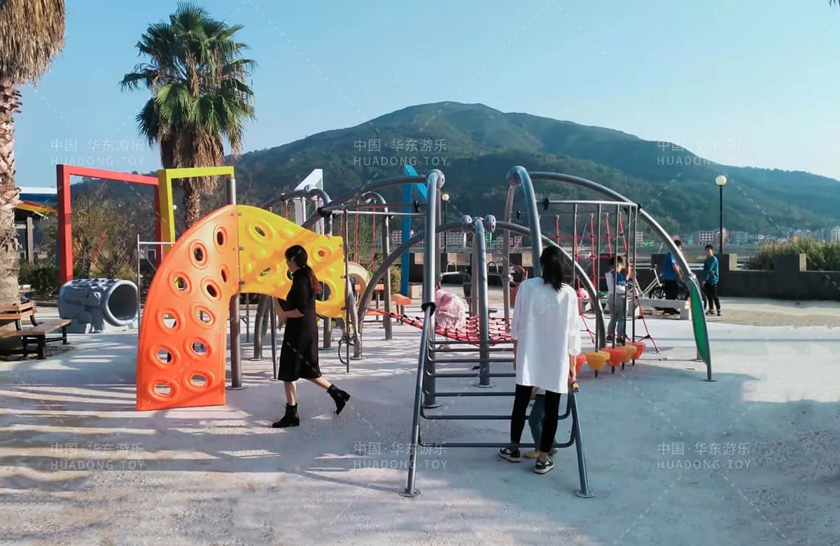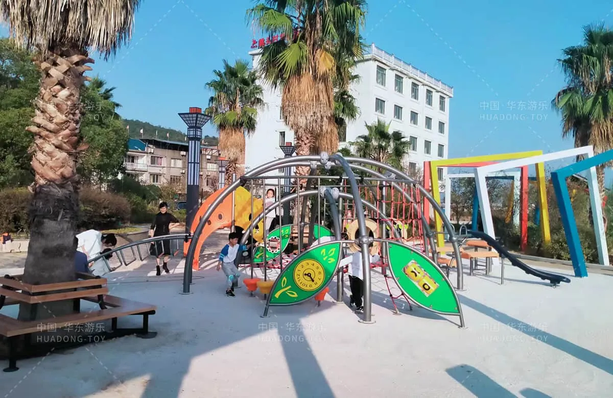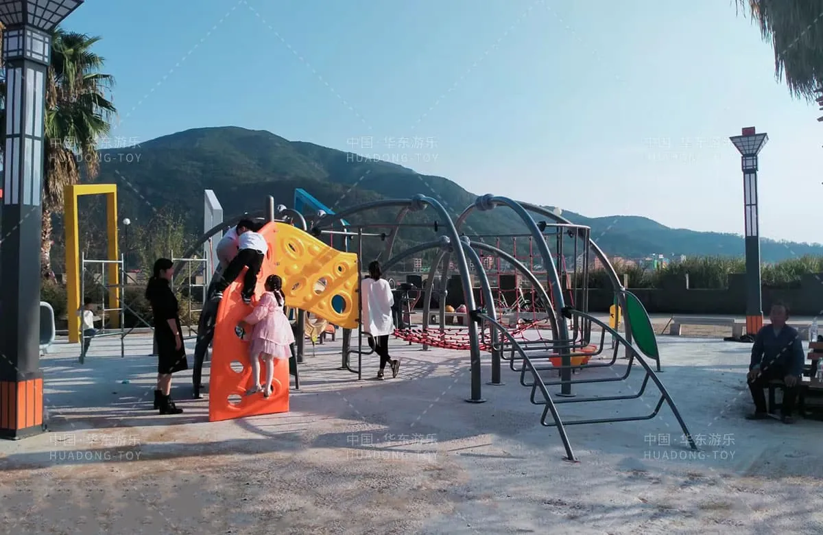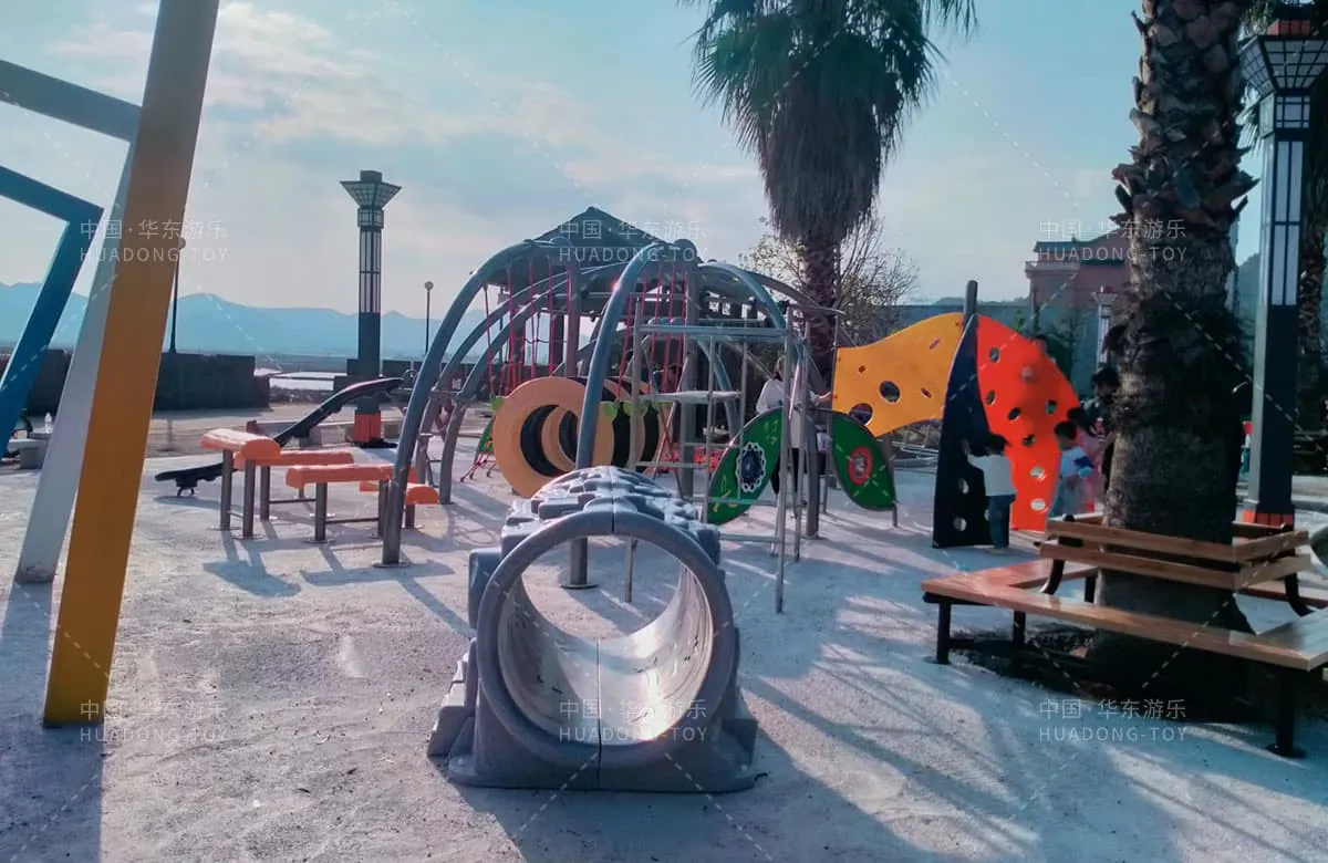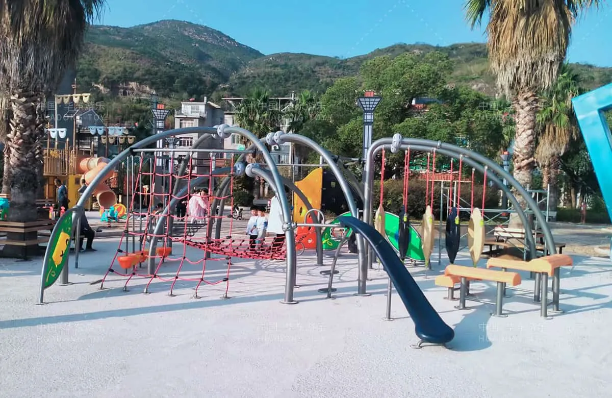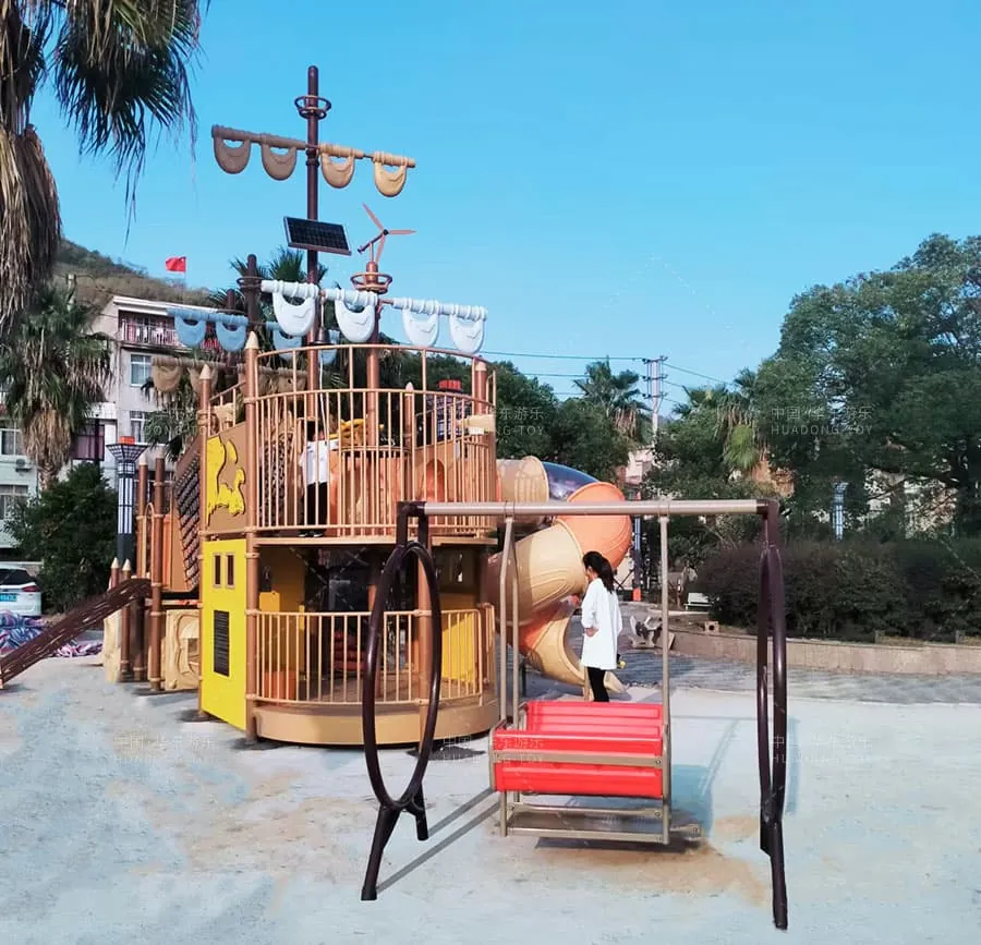 The amusement park features universal fitness equipment and kid-favorite pirate ship slides for endless fun.
