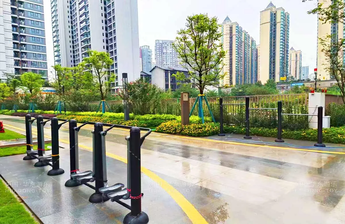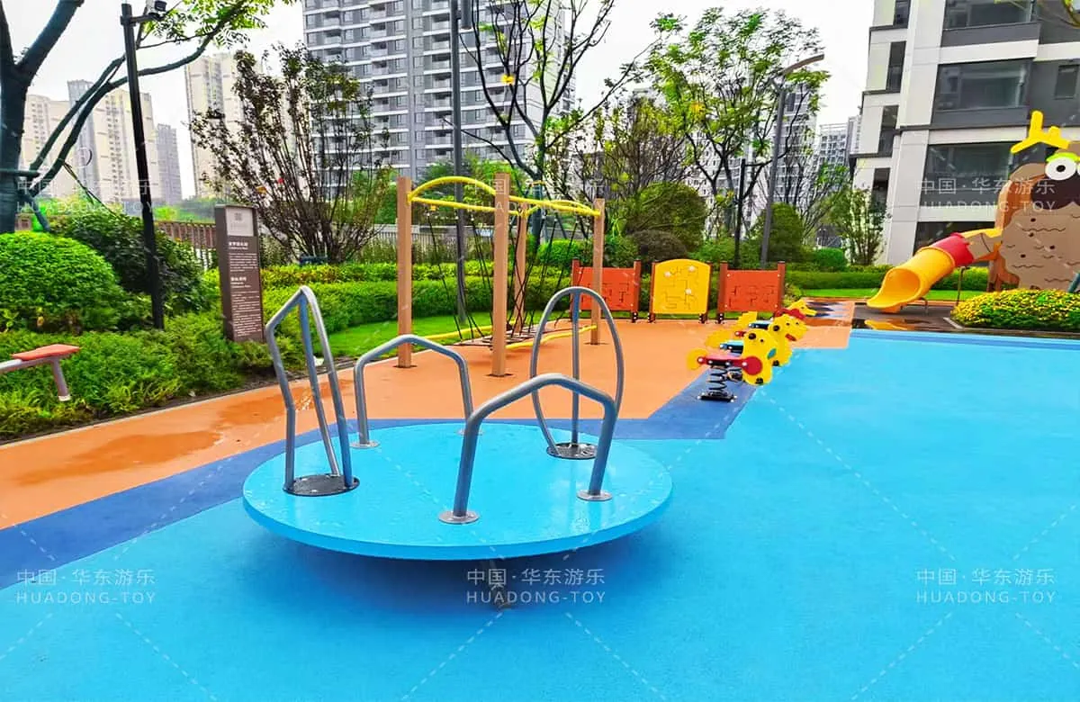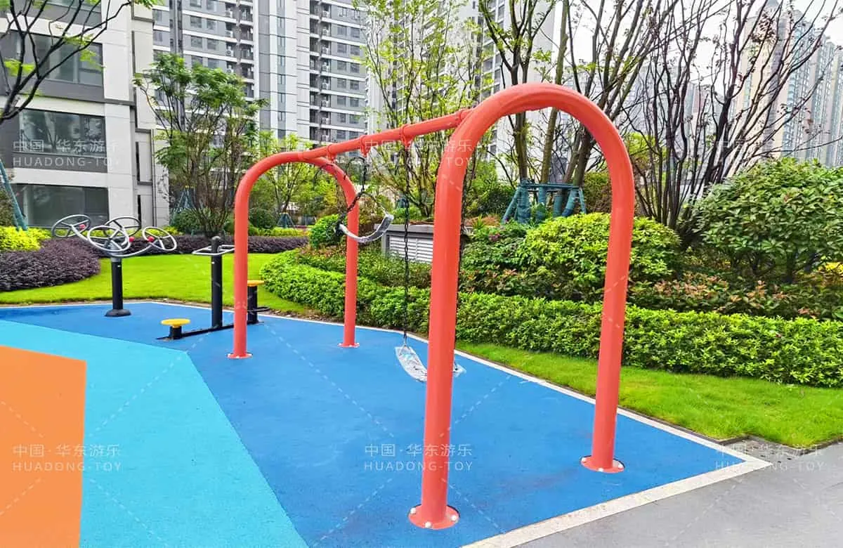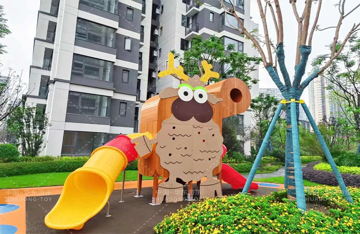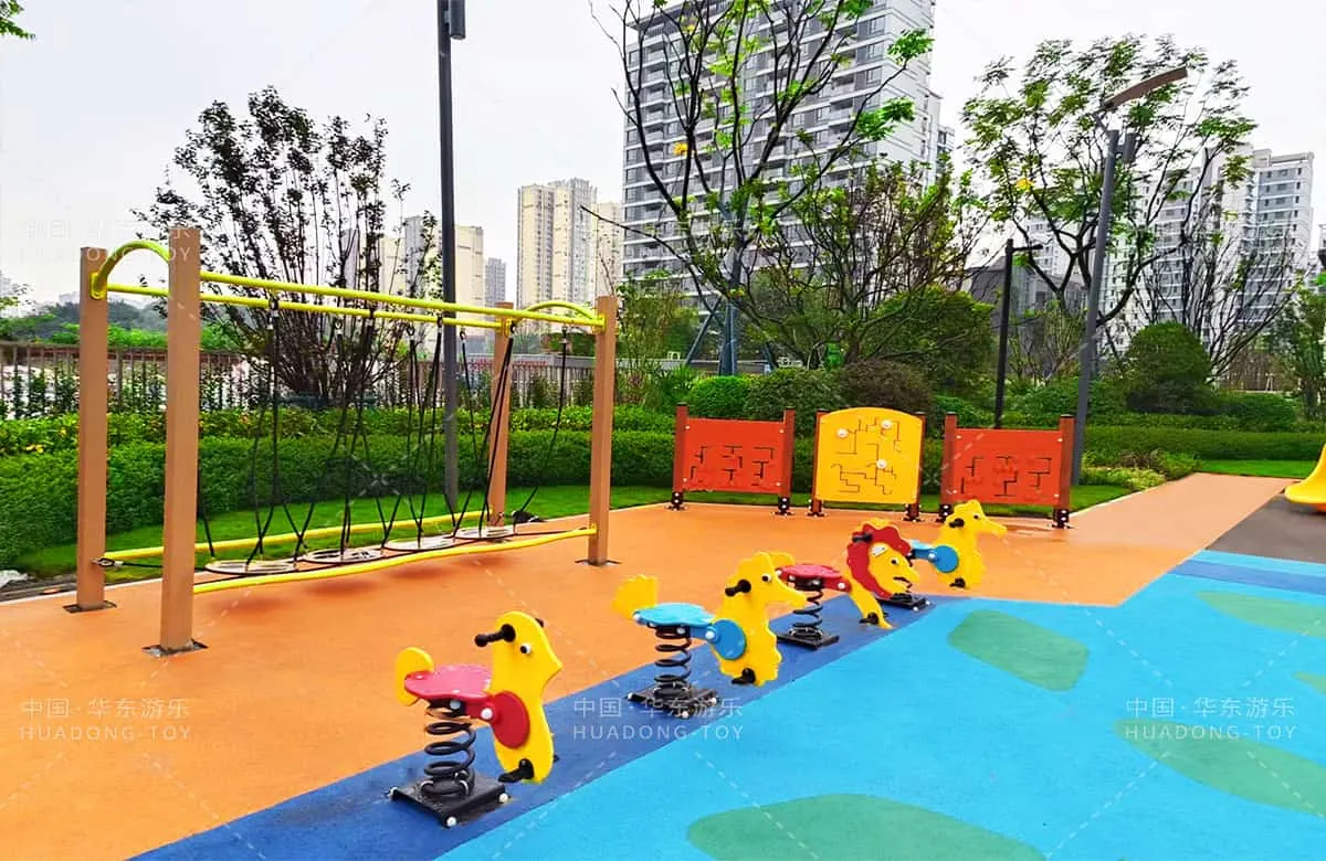 he amusement park features rocking toys, kid's swings, adult fitness equipment, mazes, suspension bridges, swivel chairs, and elephant trunk slides.