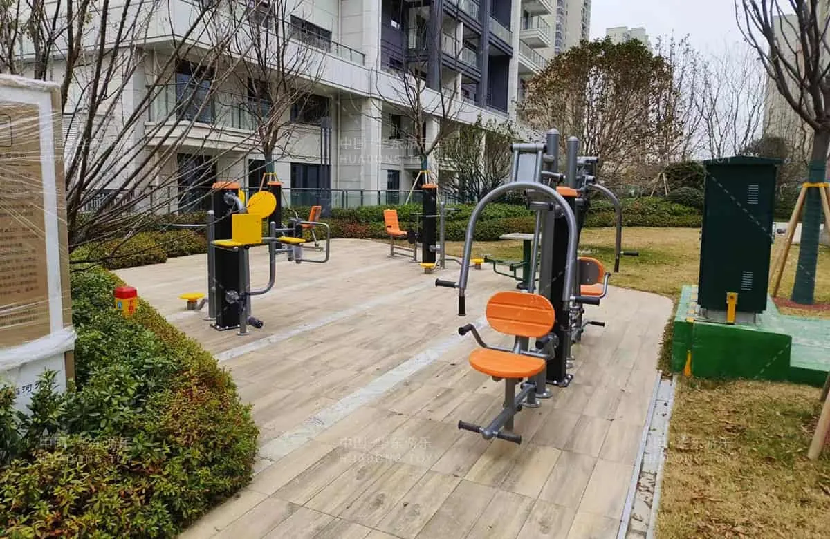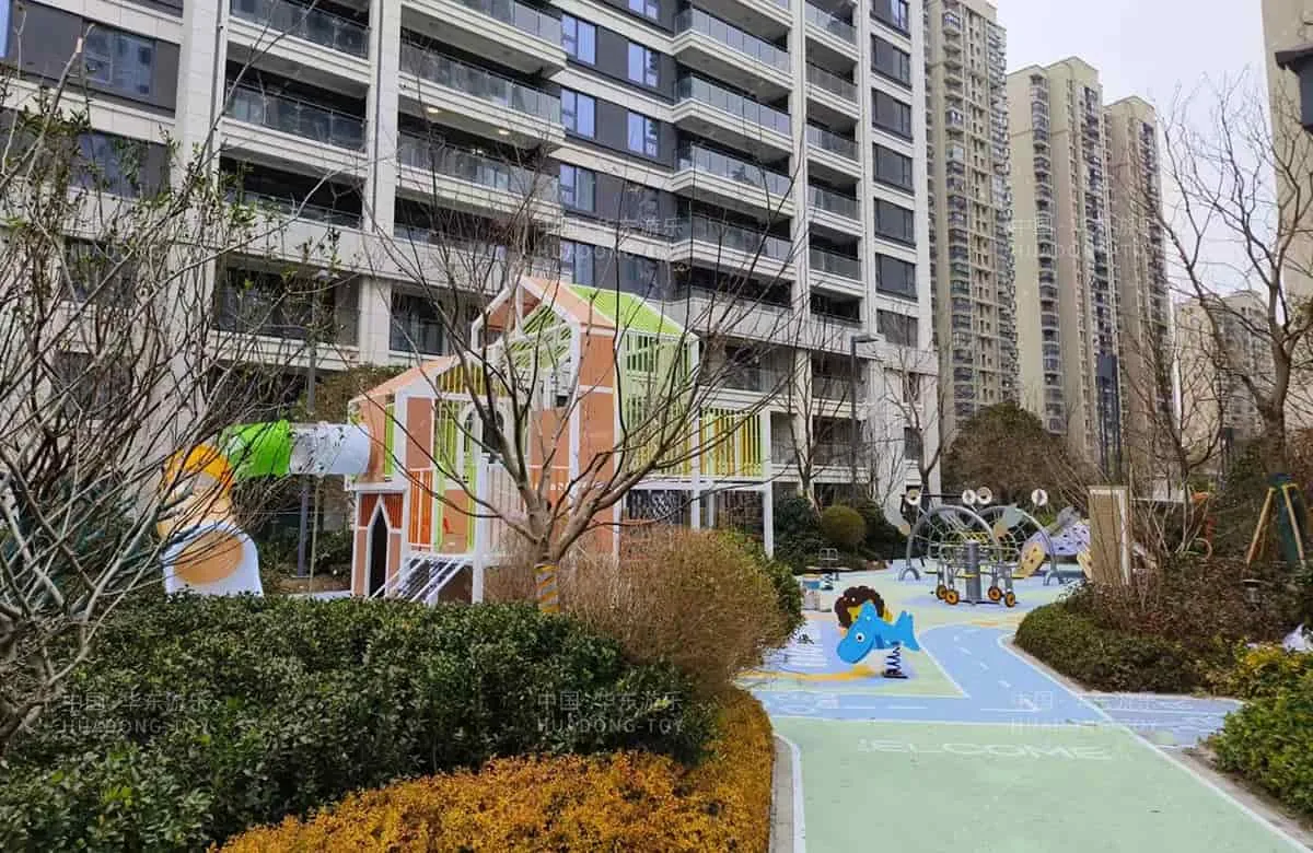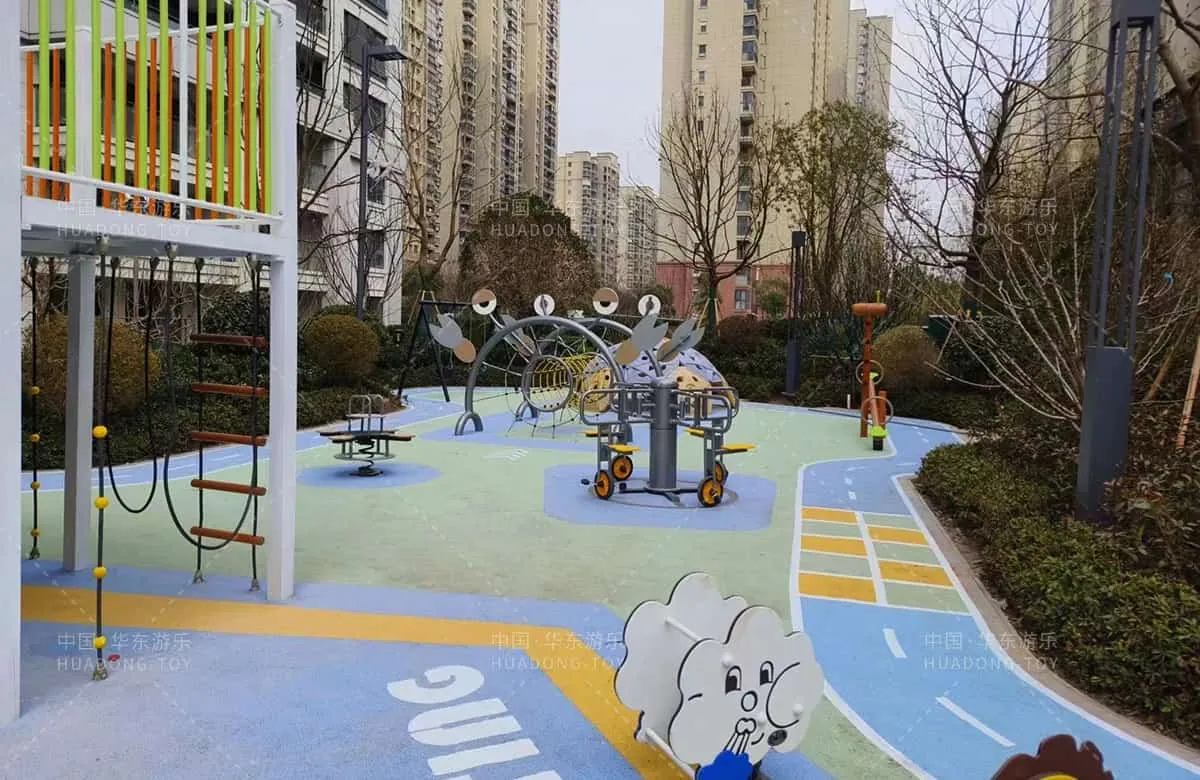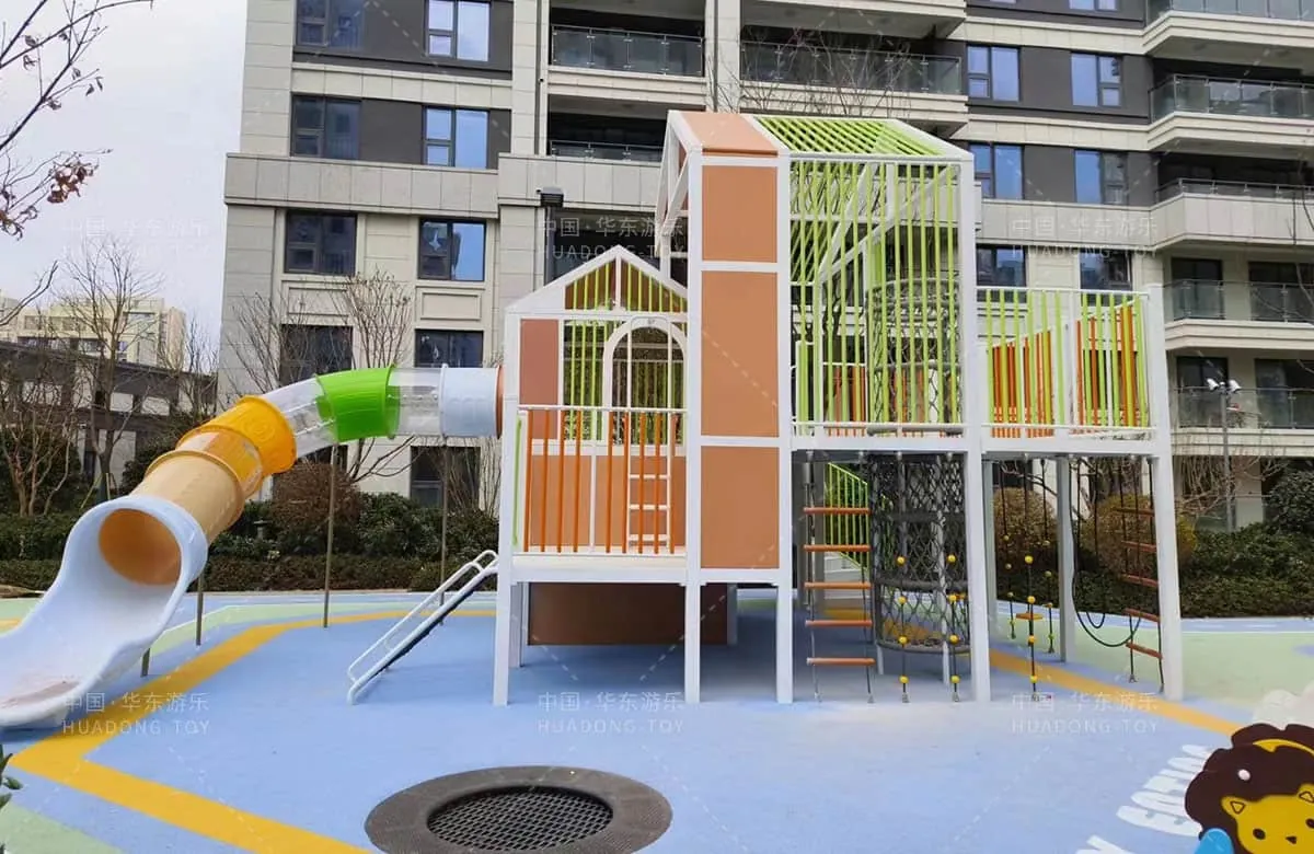 A playground combination slide featuring climbing nets, ladders, and ropes, alongside children’s favorites like swings, seesaws, and rocking horses.