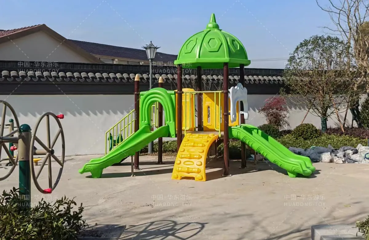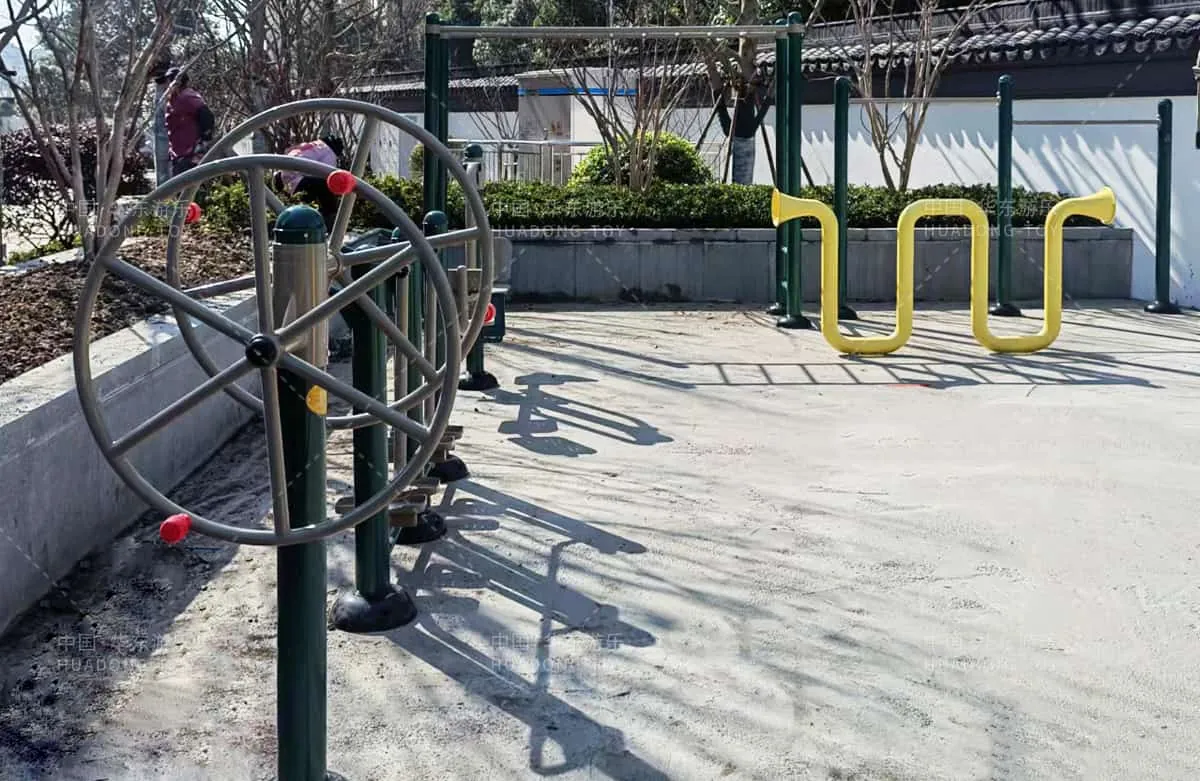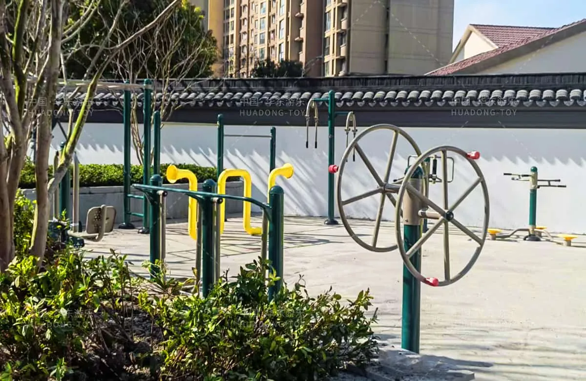 This is a villa series combination slide made of roll molding, featuring bright colors and a long service life. Additionally, various fitness equipment has been installed to better serve community residents.