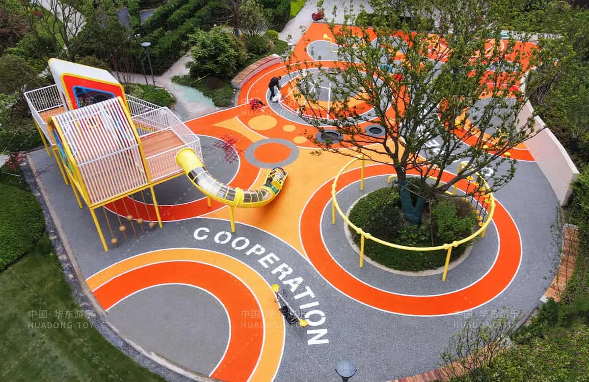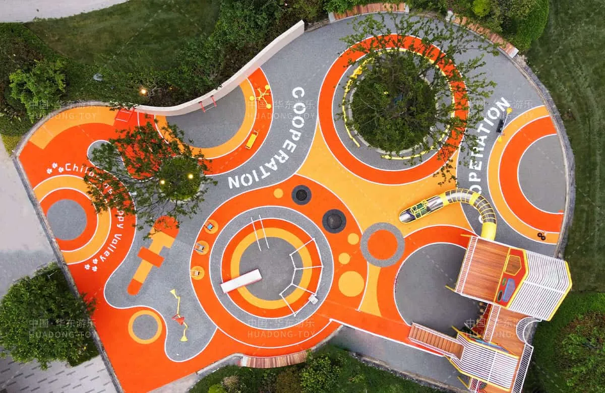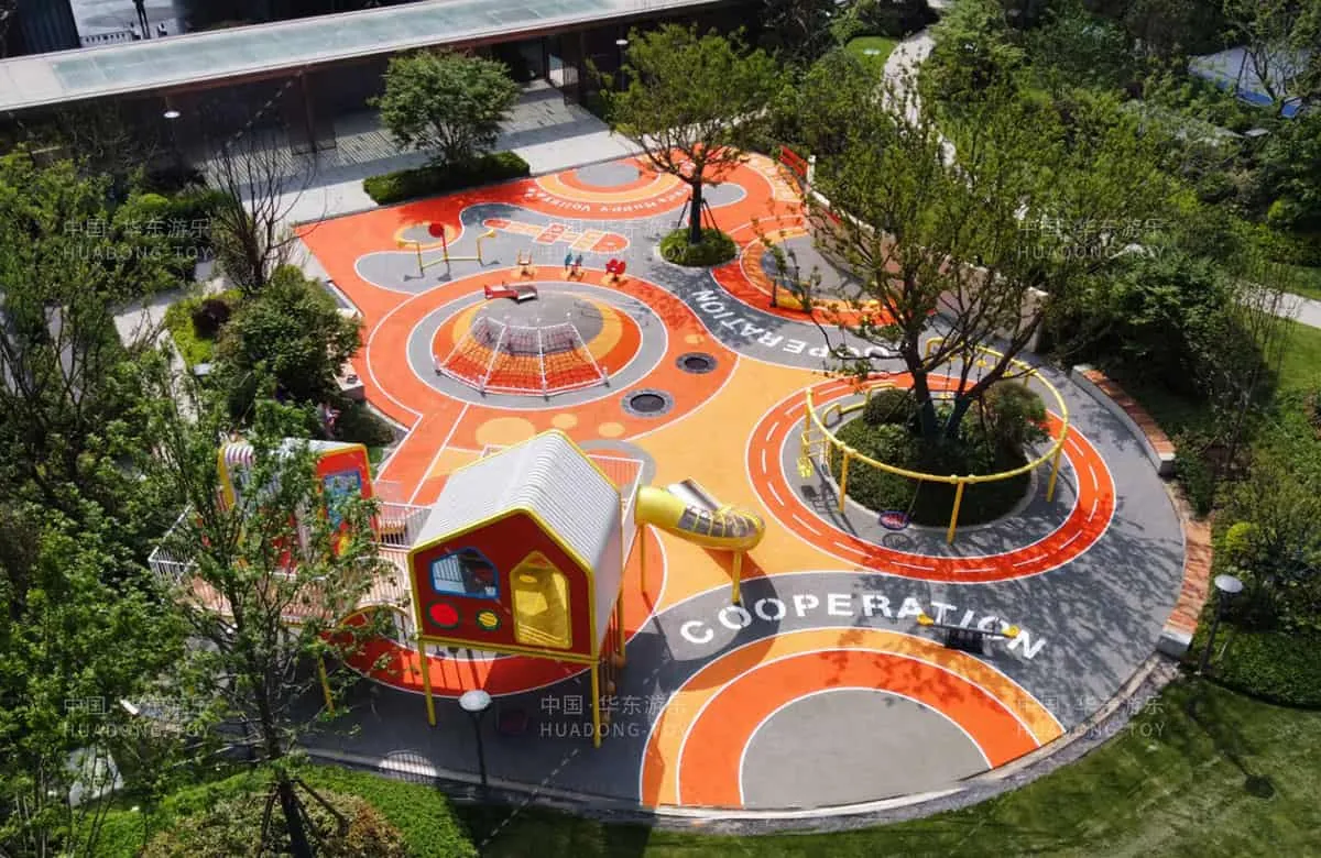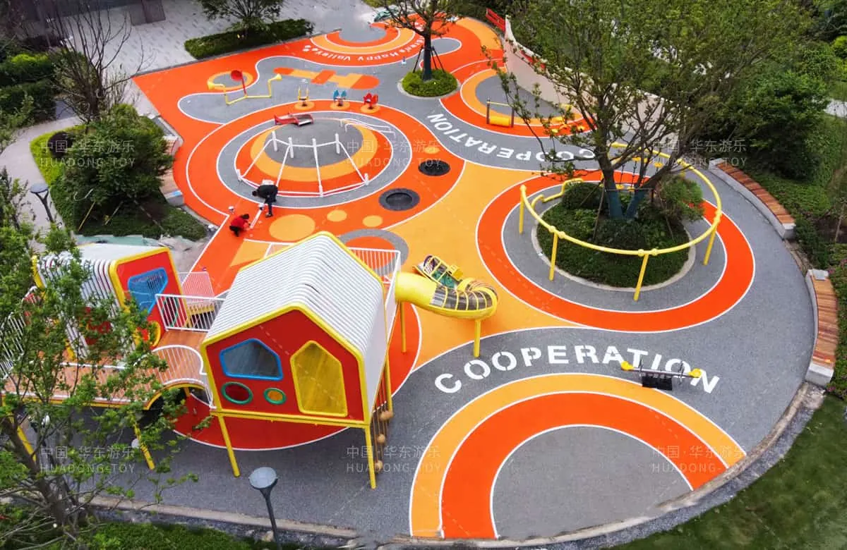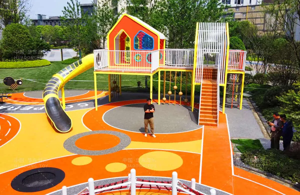 This custom game house-themed playground features climbing poles large slides cartoon shapes and vibrant colors that delight children. The entire amusement park also includes popular equipment like musical rockers sound tubes and climbing nets.