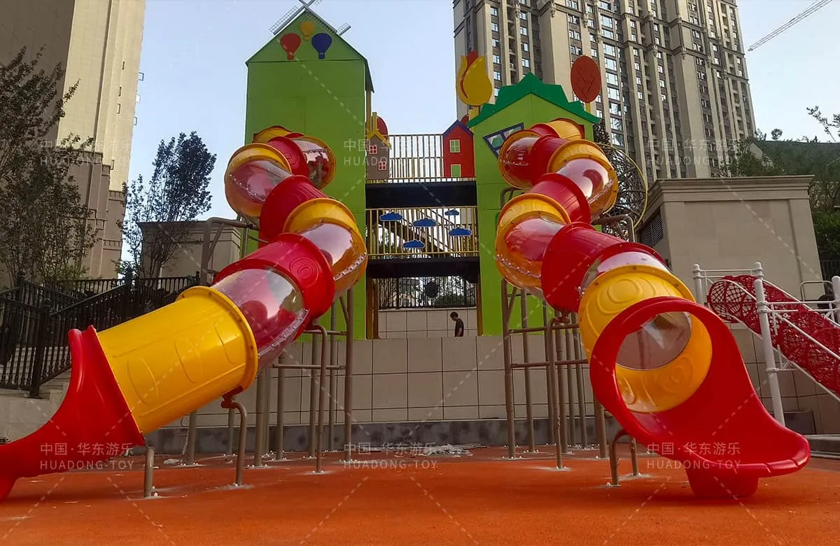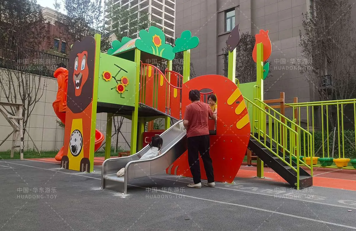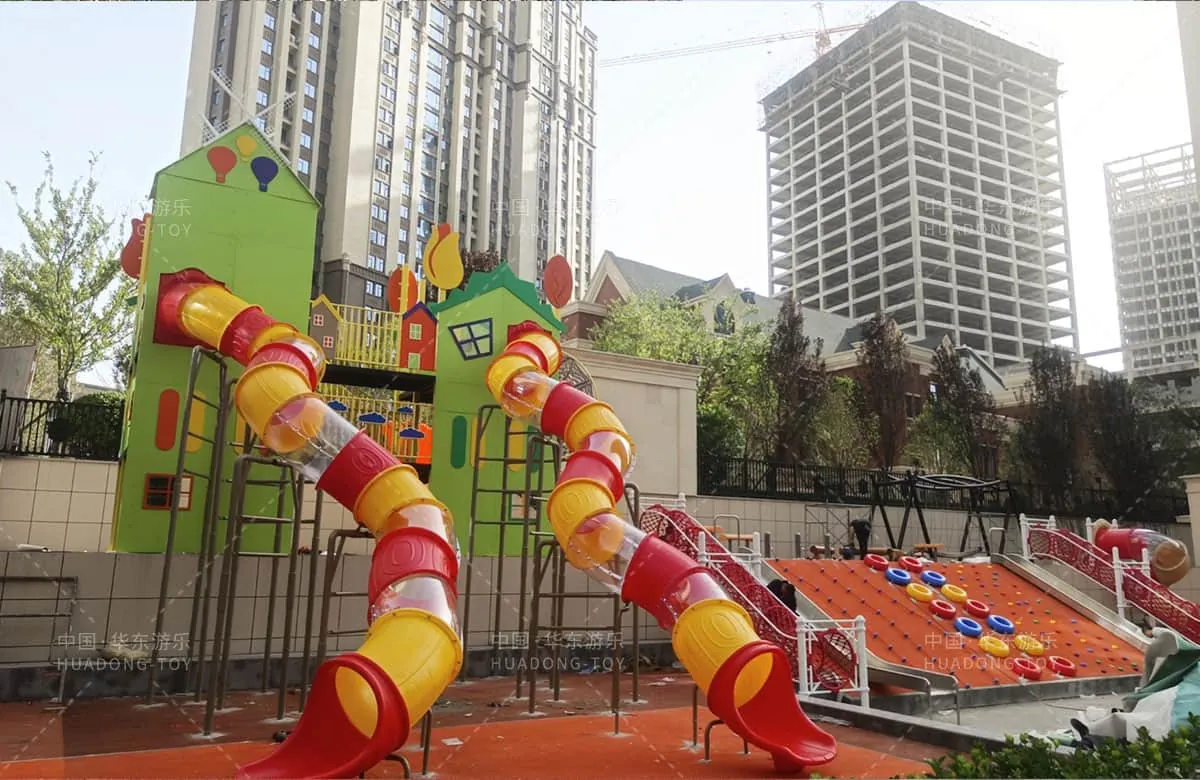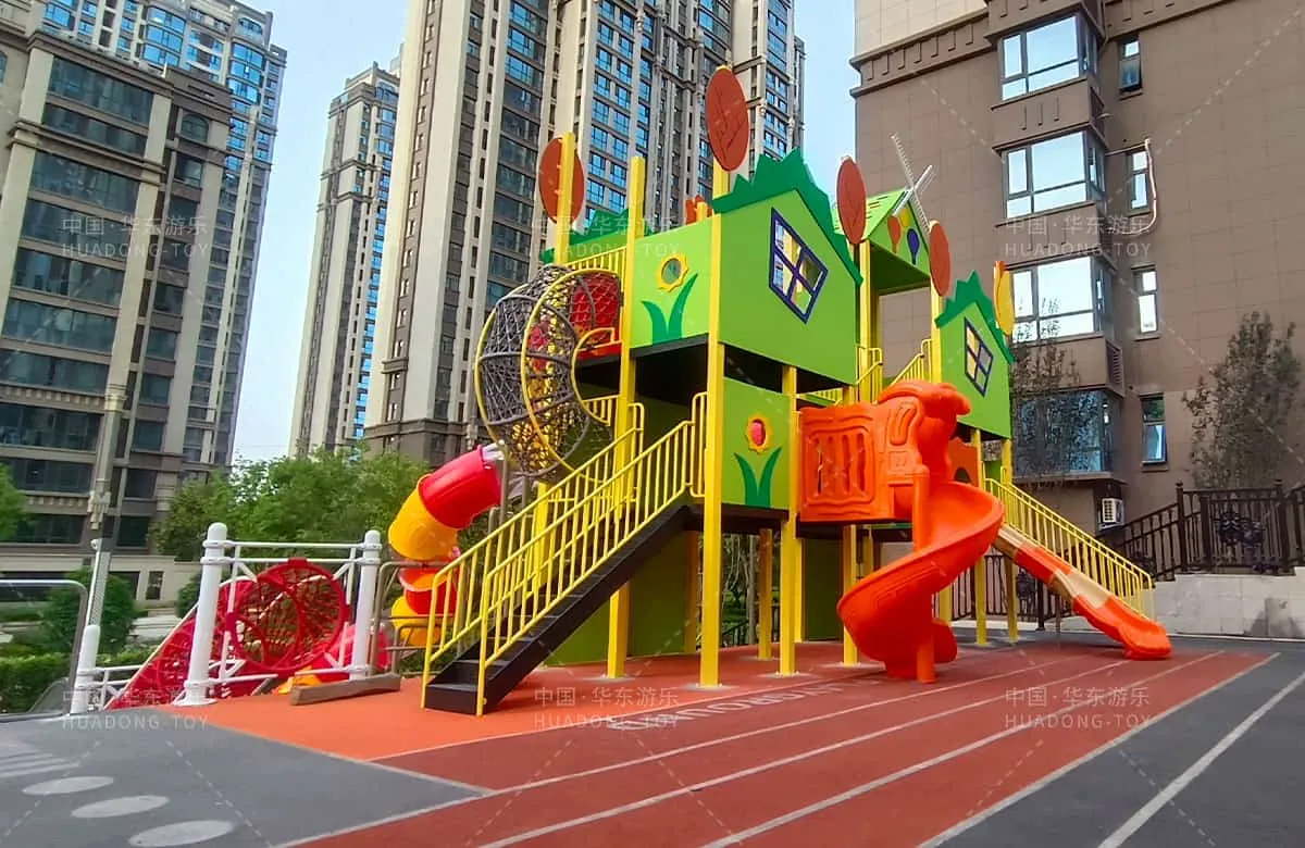 This themed playground for residential communities features children’s favorite equipment: combination slides rotating seats swings and adventure play structures. It enriches community life while supporting children’s healthy development.