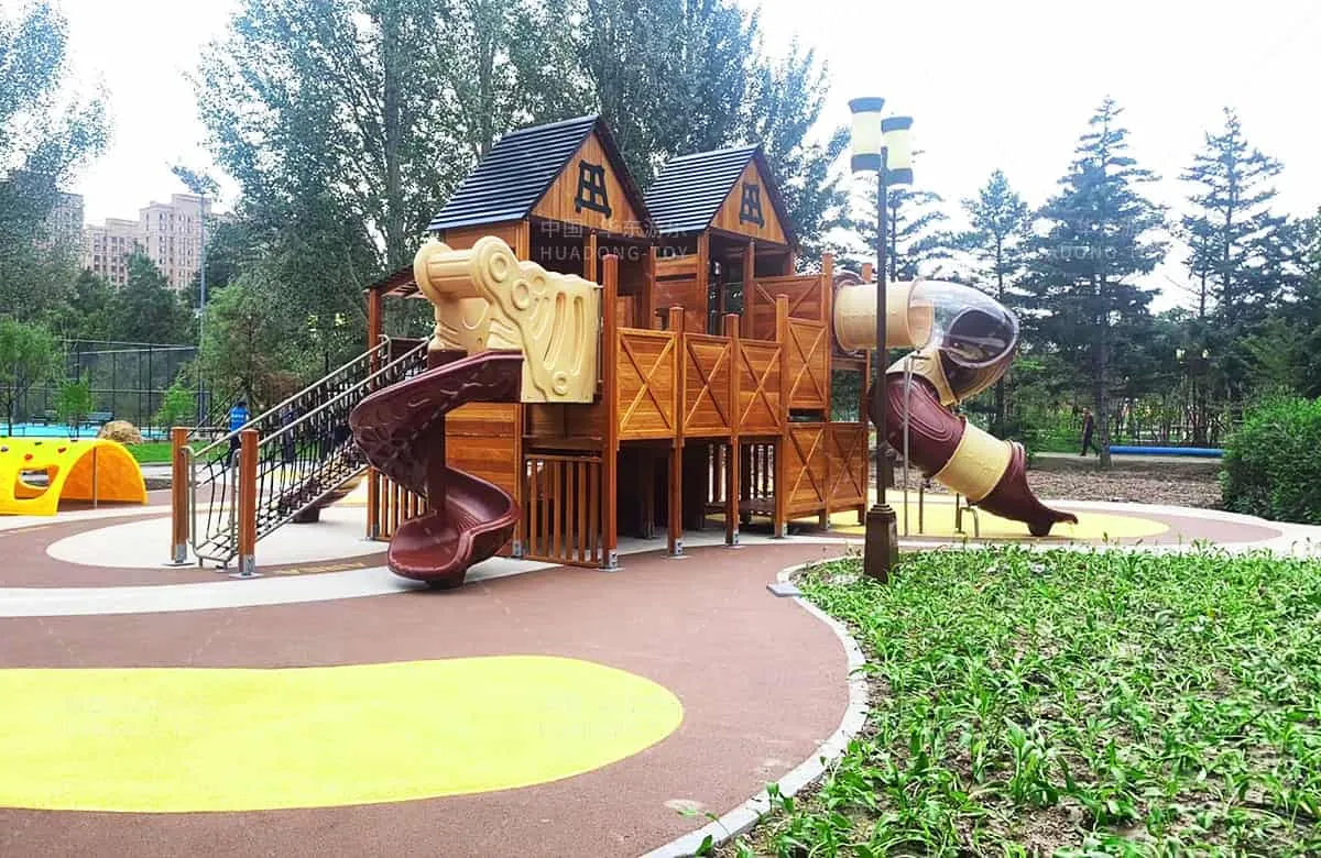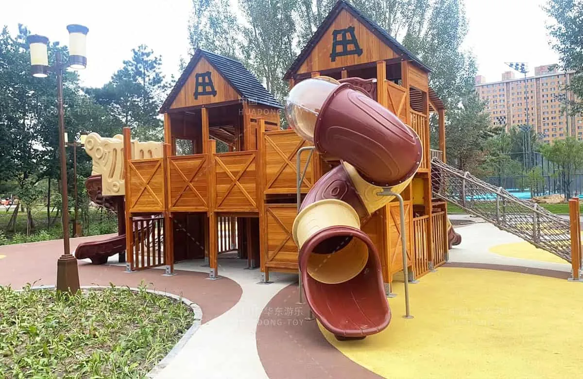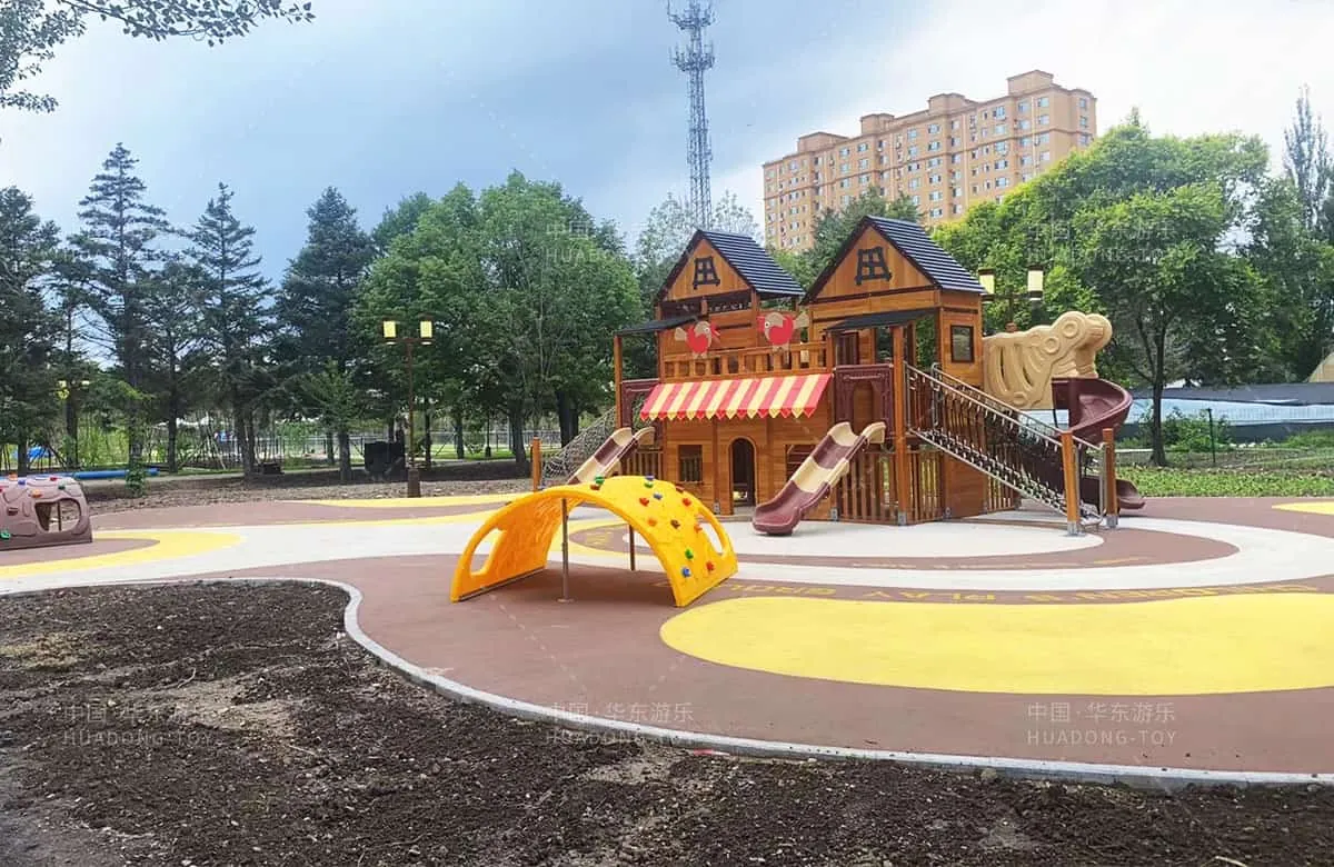 The combination slide of the wooden cabin series independently developed and designed by Huadong Play . In addition, various climbing and amusement equipment that children like are also set up, providing a leisure and entertainment place for the people.